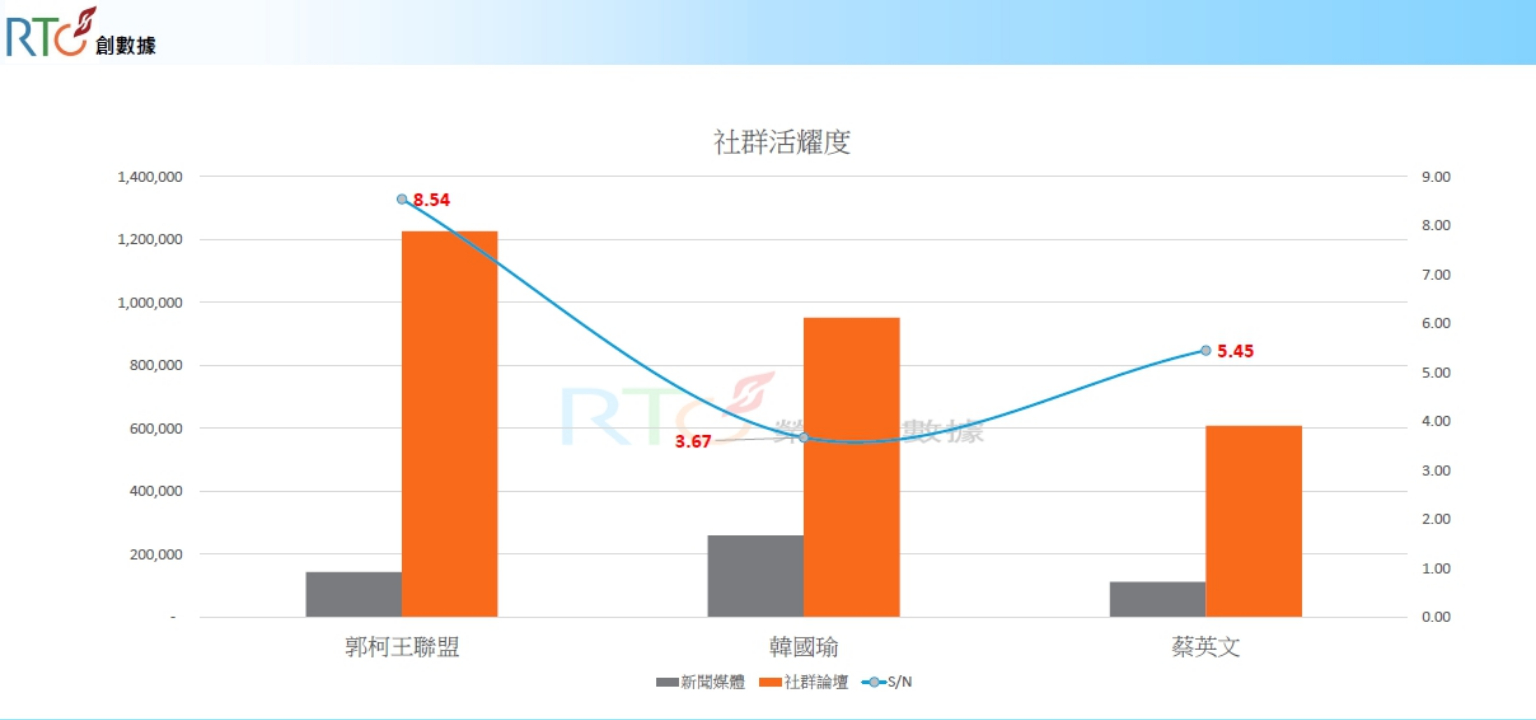 從《榮泰創數據》進一步分析的社群活躍度可以觀察到,郭柯王聯盟的表現最佳,蔡英文次之,韓國瑜則是最差,《榮泰創數據》指出,這種現象與一般人的直覺有所差異,一則顯示韓粉確實有退散的情況,一則是其人氣來自於新聞媒體力量在支持。確實,若扣除挺韓的電子、平面、網路媒體,韓國瑜還真的是乏善可陳。