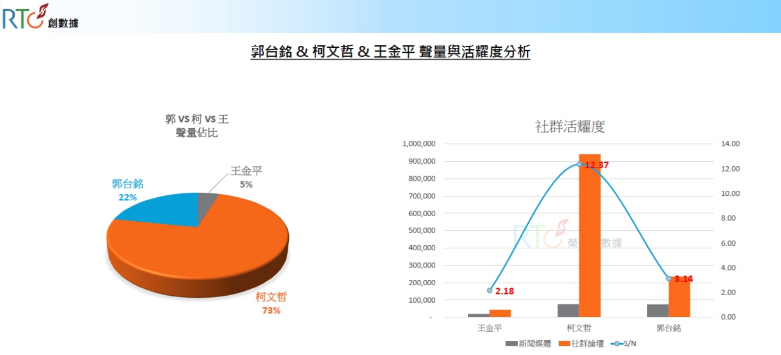 若把郭柯王三人個自的聲量拆解分析,可以看出在APP、社群、論壇、新聞、影音等五項熱門度評比中,在社群熱門度部分,柯文哲可說獨佔鰲頭,郭台銘則是在新聞熱門度及論壇熱門度上面領先柯以及王兩位,影音熱門度則是王金平取得領先。《榮泰創數據》表示,由於柯在社群的領先幅度很大,目前郭柯王聯盟的空軍還是靠柯文哲,陸軍則要靠王金平與郭台銘。
