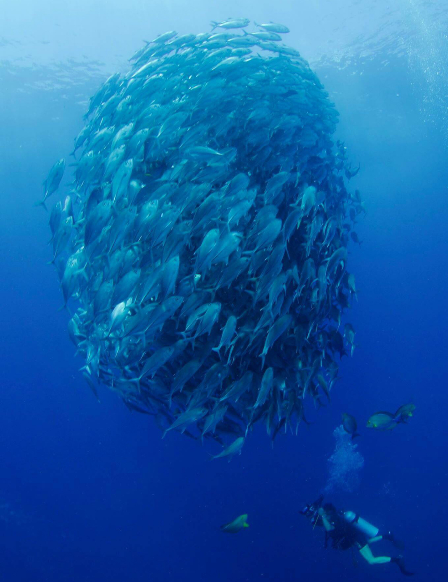 沙巴共有32個族群,共 80 種方言。每年的3到9月是到馬來西亞潛水的最佳月份,均溫在25至30度間,住在當地海上小木屋式Villa打開門後,天海一色沒有分界,白色細沙在腳邊流動著。隨身拿起裝備就能跟團下水,當中除了滿滿的海洋繽紛世界,還有水中嬌客六帶鰺(Caranx sexfasciatus)群聚遷移的壯觀景象,排列與龍捲風狀過境無異,各個角度怎麼拍都美。每隻穿梭的過客姿態優雅,碰觸到任何的外物,分散後隨即組隊前行,海底的芭蕾世界就此展開。