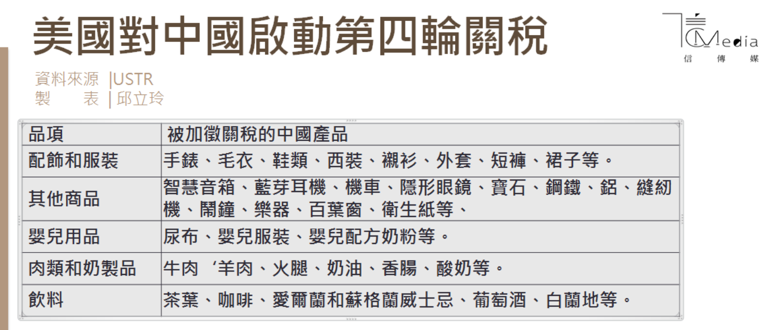 美國自9月1日起對3243個品項的中國商品加徵15%的關稅,這是美國啟動第4輪關稅,消費品的占比高達5成,而第3輪關稅當中,消費品占比只有2成多。