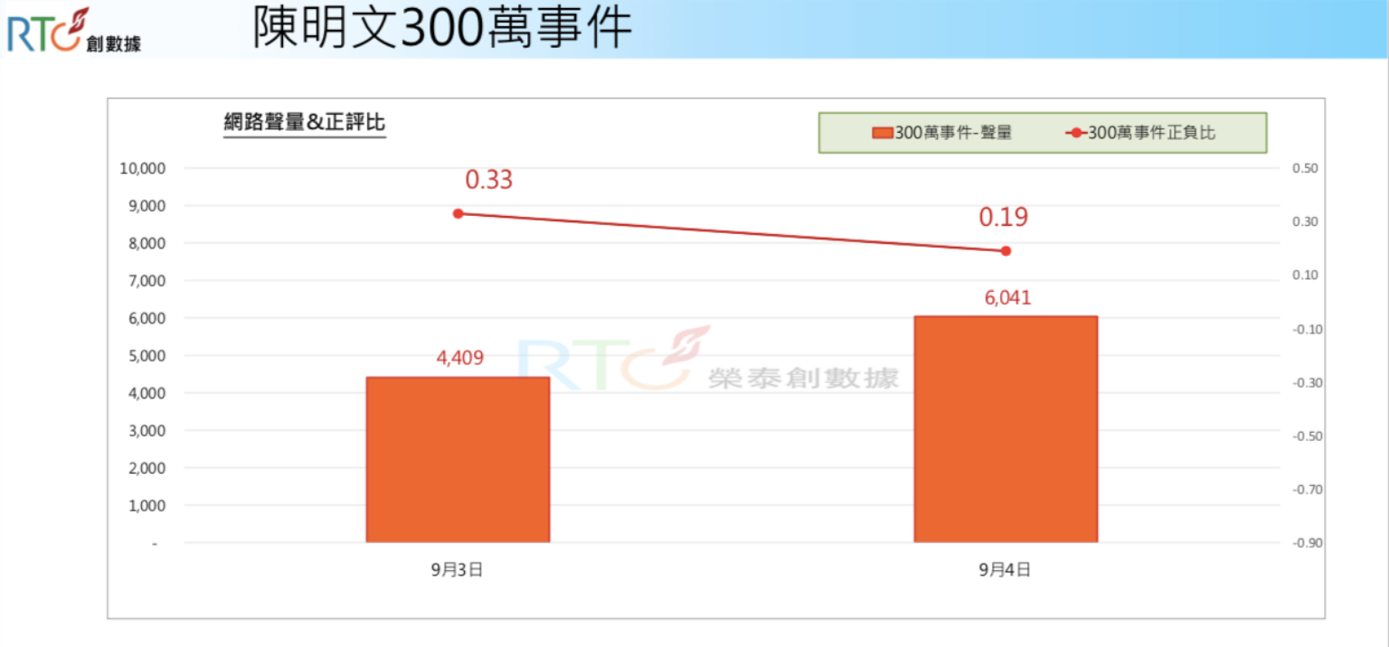 根據《信傳媒》委託《榮泰創數據》所做的分析資料,300萬現金事件爆發當天,網路討論量是4409則,其中負面聲量是正面的3倍之多,正負比為0.33。《榮泰創數據》從網路輿情觀測發現,網民對於陳政廷「借錢出國創業」的說法,大多是無法接受。