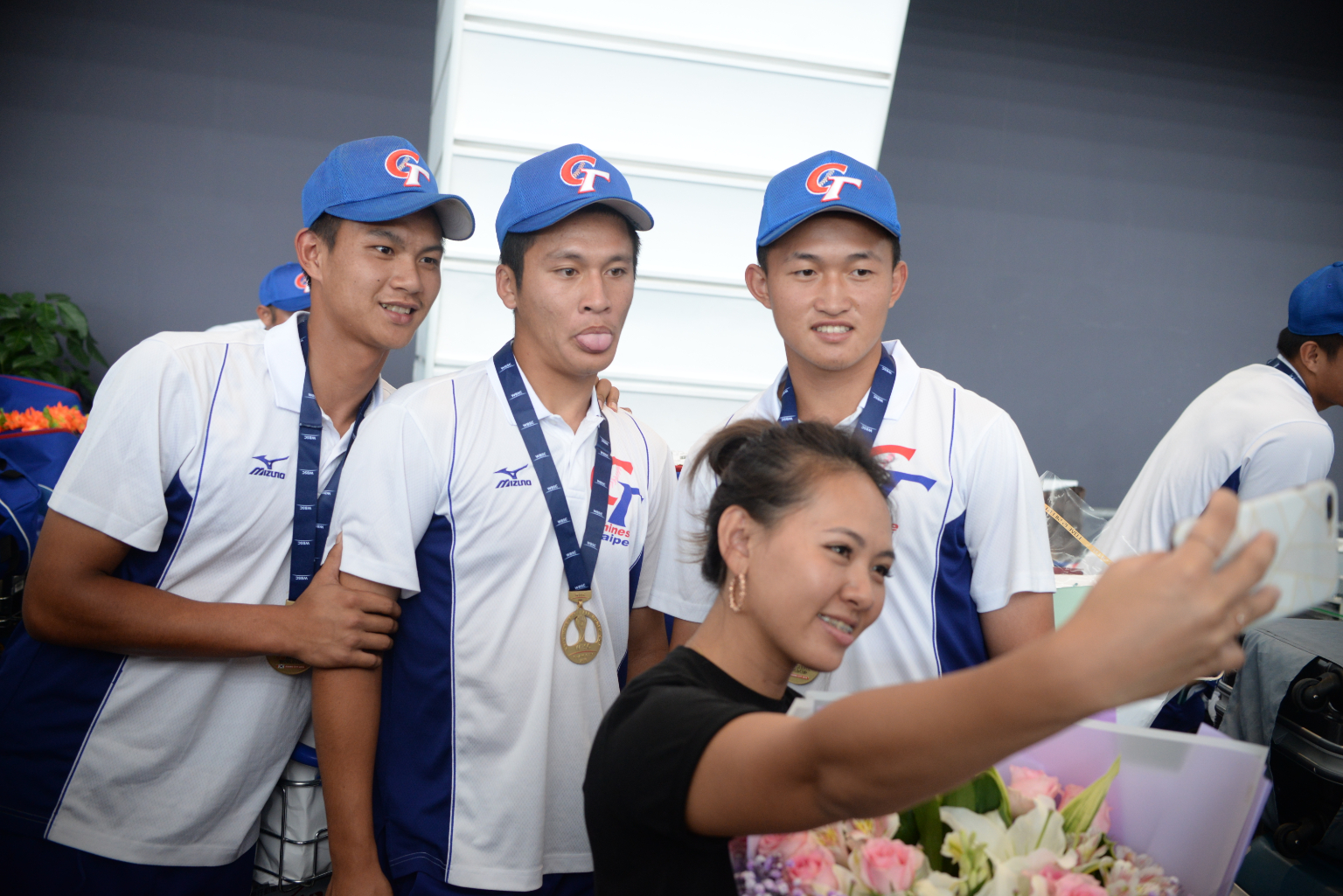 中華隊球員帶著獎盃及國旗踏進國門。(攝影 / 趙世勳)