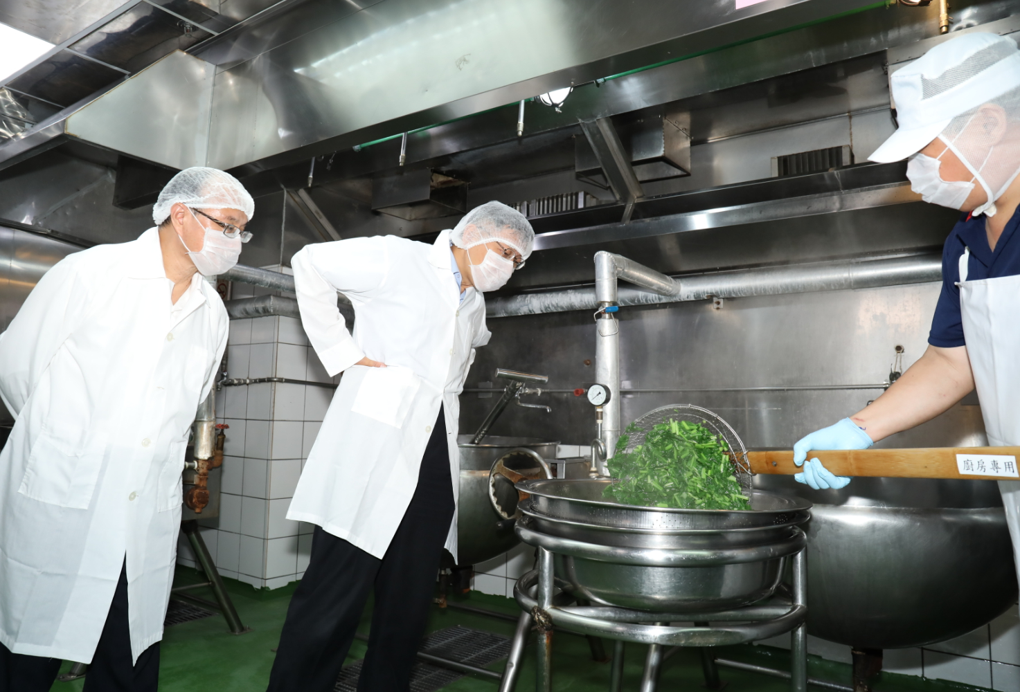 柯文哲與市府隨行人員,一同視察健康國小的中央廚房。(攝影 / 趙世勳)