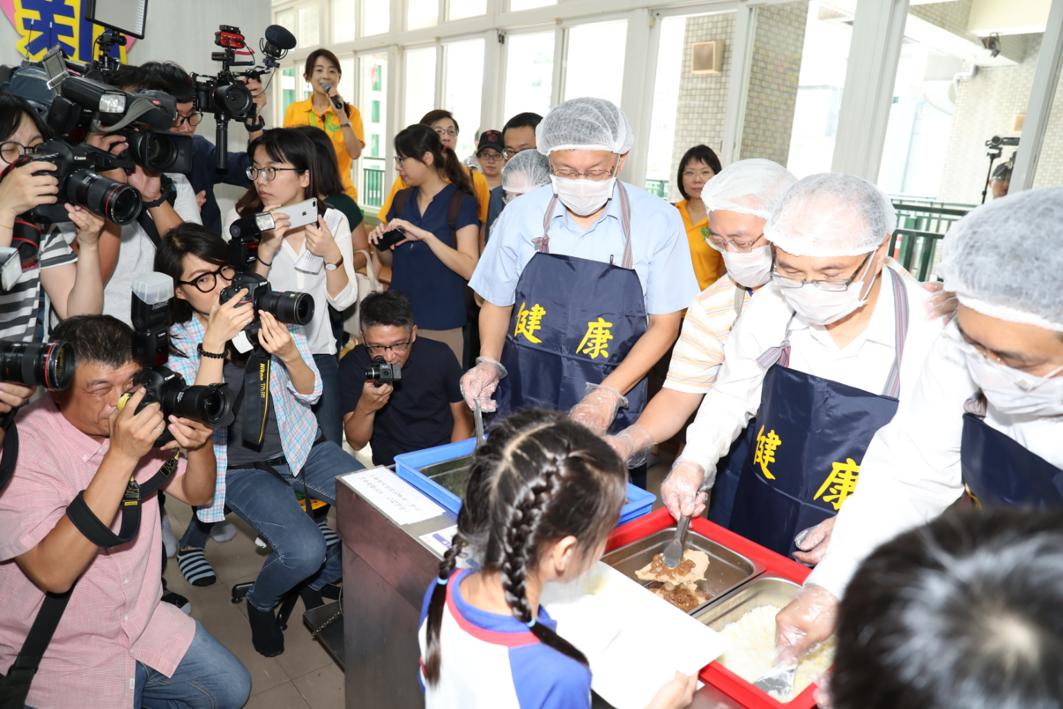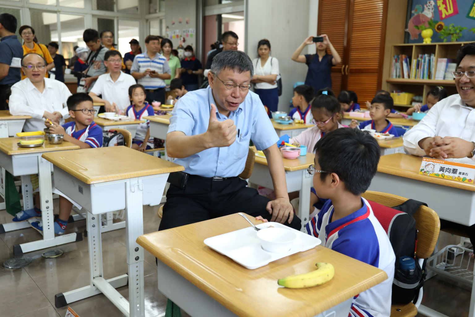 柯文哲中午到健康國小視導有機蔬菜的進貨、驗收、清洗、烹煮等流程,在參訪學校中央除後之後,移動到二年級教室,柯在校方人員協助穿上圍裙,擔任打菜小天使,接著坐在男學生們的座位中間,開始與學生共進午餐。