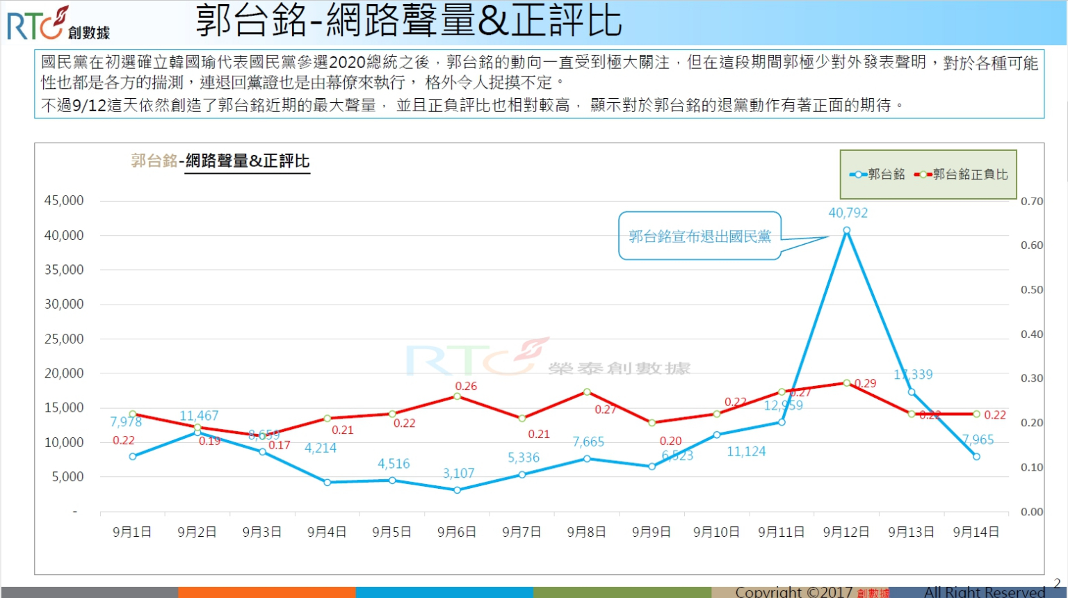 《榮泰創數據》分析指出,網友對於郭台銘退出國民黨似有正面的期待;進一步解讀,此現象暗示著,部分民眾希望2020大選,有藍綠以外的第三組選擇。