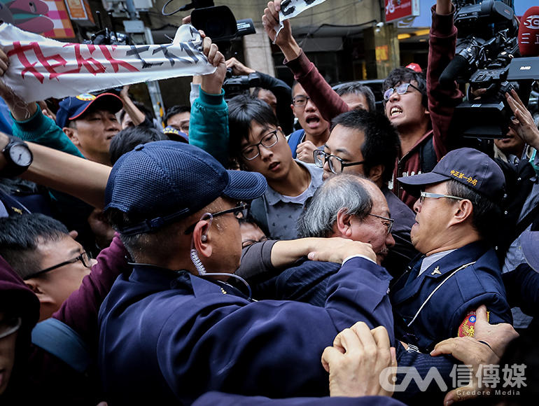 中午12點5分,柯建銘出現在青島東路轉角的7_11,現場有媒體大喊:「柯建銘在這裡」,抗議民眾全部一湧而上,一桶水潑在柯建銘身上,隨即被壓到地上,警方雖向前護衛老柯,但仍經歷一陣肢體拉扯。