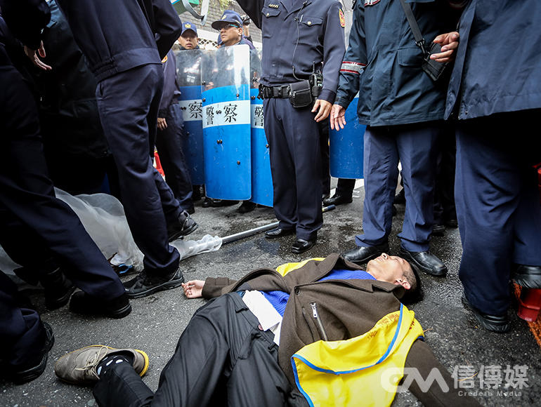 其實在一陣推擠中,現場不只鞋子掉滿地,勞團、記者也都掛彩,還有平面攝影被壓倒在地受傷,還因為胸悶被送到台大醫院急診。
