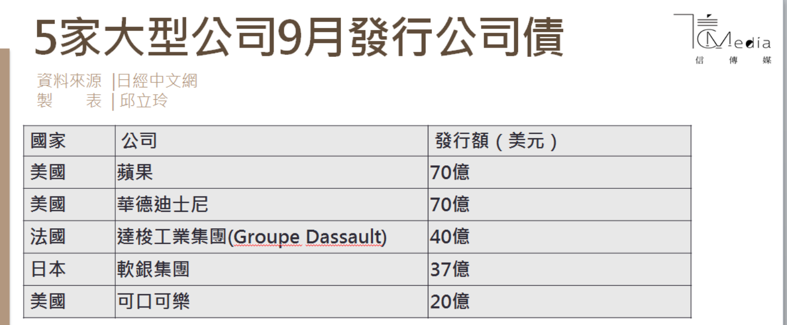 另外,美、日、法大型企業9月發債也受到矚目。其中,美國蘋果公司發債籌資70億美元,將資金用於分紅以及回購自家公司股票等。