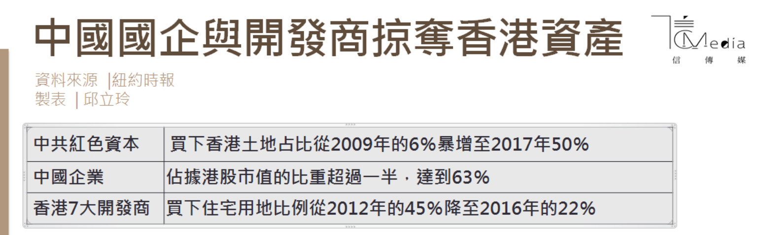其實,中共國企和開發商等紅色資本早已搶奪香港一半土地,但最近還逼著香港四大家族捐地,主因延燒3個多月的反送中示威運動遍地開花,演變為年輕人誓死爭取自由民主、卻被港警打爆的流血革命,中共想要藉此轉移目標,將民眾仇恨的對象從中共轉移到富豪身上,希望化解中共執政危機。