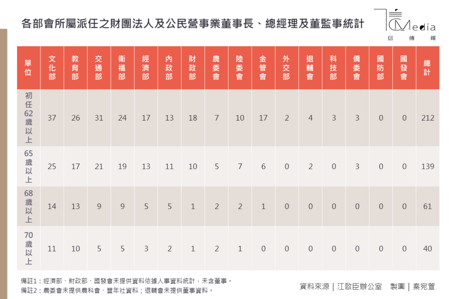 根據江啟臣國會辦公室統計,文化部70歲以上的負責人、經理人,及董監事有11位,初任62歲以上有37位;教育部70歲以上有11位、初任62歲以上有26位;交通部70歲以上有5位、初任62歲以上有31位,成為「最友善老人」的前3名部會。