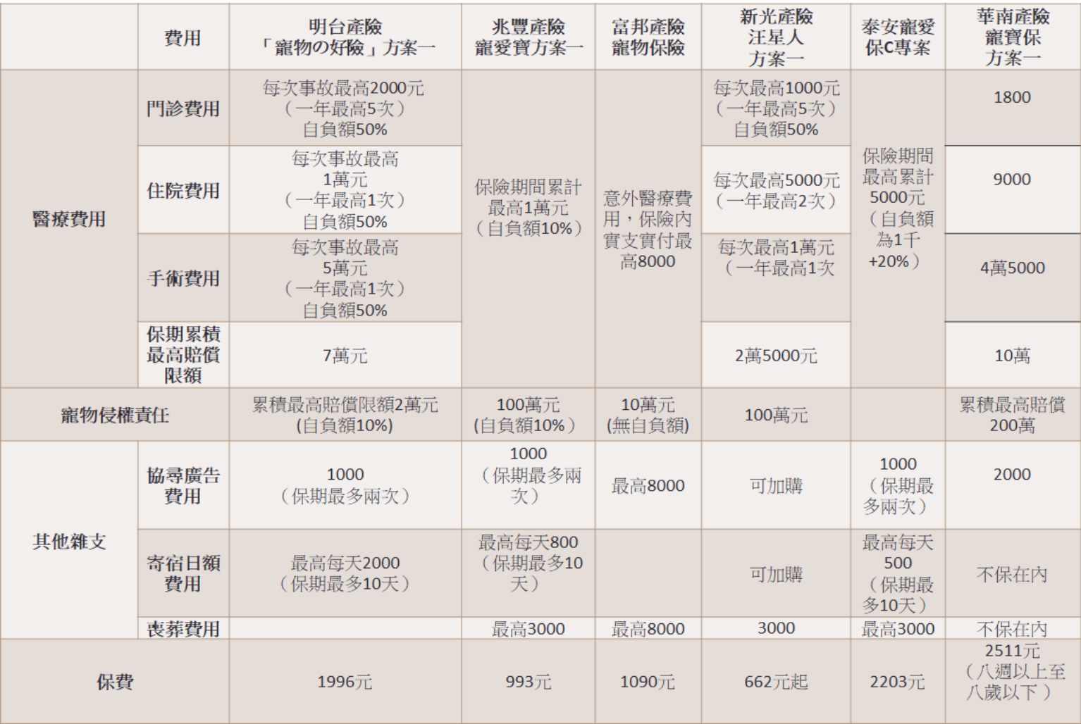 以2012年在台灣就推出首張寵物保險的明台產險來看,「寵物の好險」方案一的寵物醫療費用補償分為門診、住院以及手術費用,且每個細項實支實付的保險金給付金額具有上限,同時也有50%的自負額限制。保險期間累積最高補償限額為7萬元。