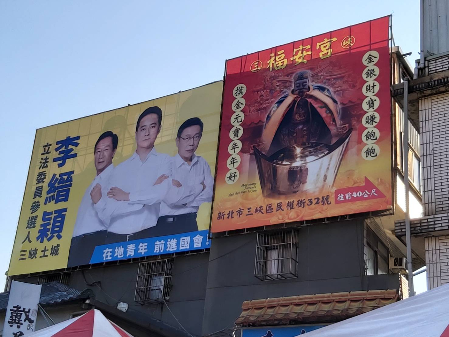 全台第一面郭台銘、柯文哲同框的輔選看板,就高掛在三峽清水祖師廟前,由李縉穎搶到頭彩。