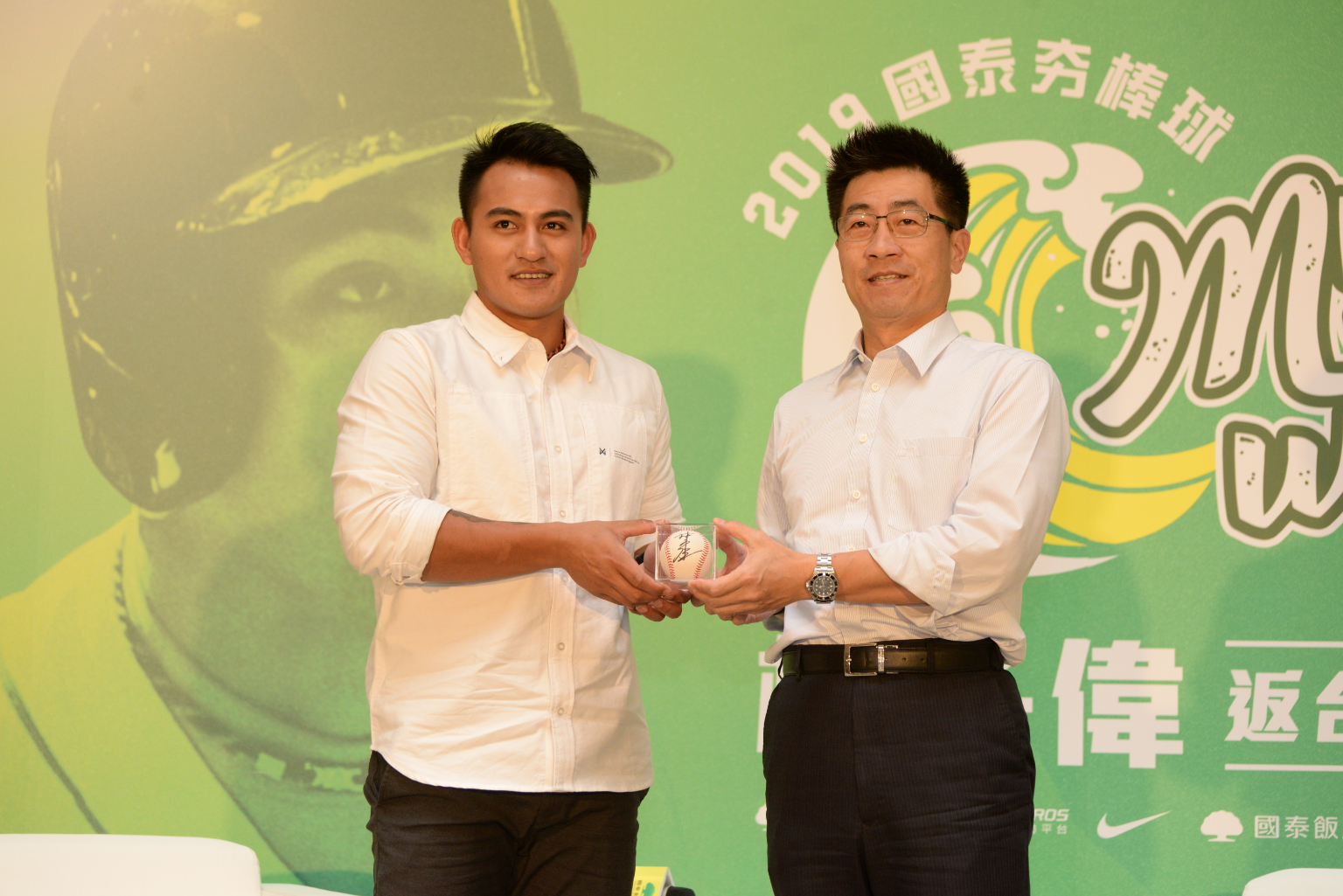 林子偉(左)和國泰世華銀行行政長周衛華互動熱絡,並贈予自己的親筆簽名球。(攝影/趙世勳)