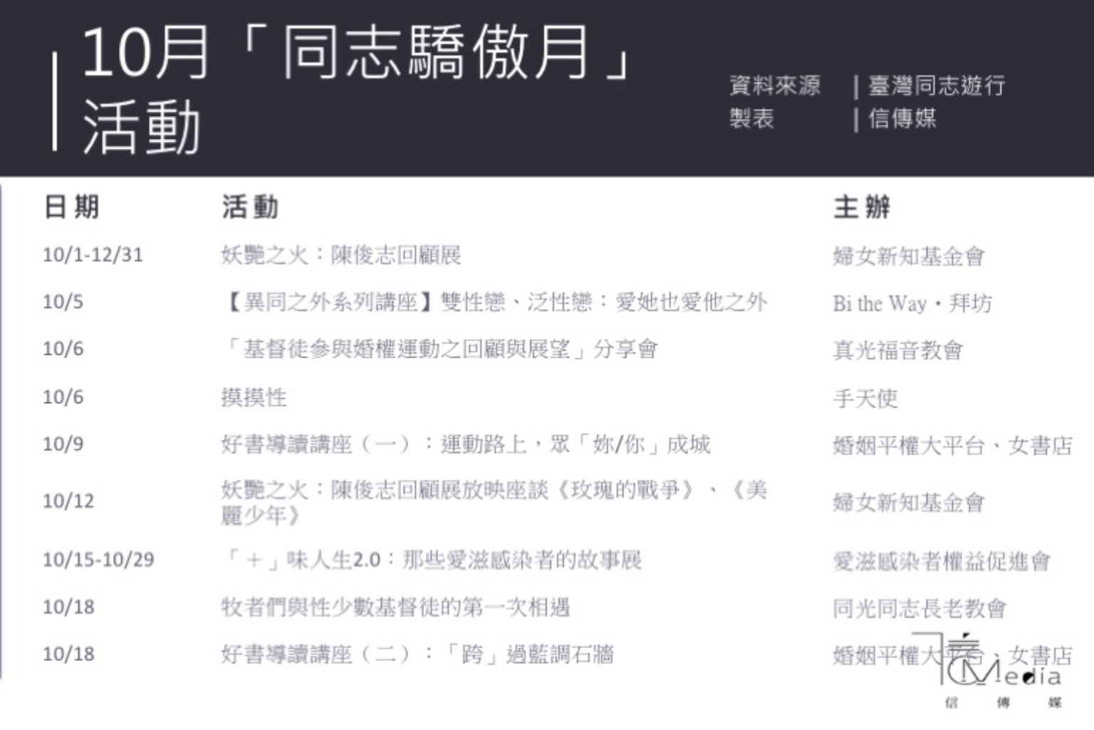 同婚元年、第17屆同志大遊行將在26日舉辦,將以「同志好厝邊」,邀請台灣社會一起當同志的好鄰居。除了遊行之外,主辦單位與協辦團體為了讓大眾可以認識更多同志族群的不同面向,且深入了解現階段同志面臨的不同議題,從10月開始將有相關活動,將10月打造為台灣「同志驕傲月」。