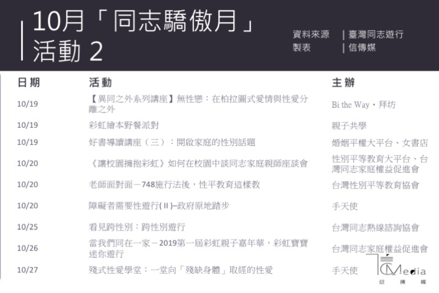 今年遊行主辦單位的台灣同志諮詢熱線協會,協同12個合辦及協辦團體,在10月舉辦多場周邊活動,橫跨教育、宗教、家庭、愛滋、同志運動、性傾向和性別認同、身心障礙等,並透過講座、座談、工作坊、導讀、遊行、展覽等方式展開一系列活動。