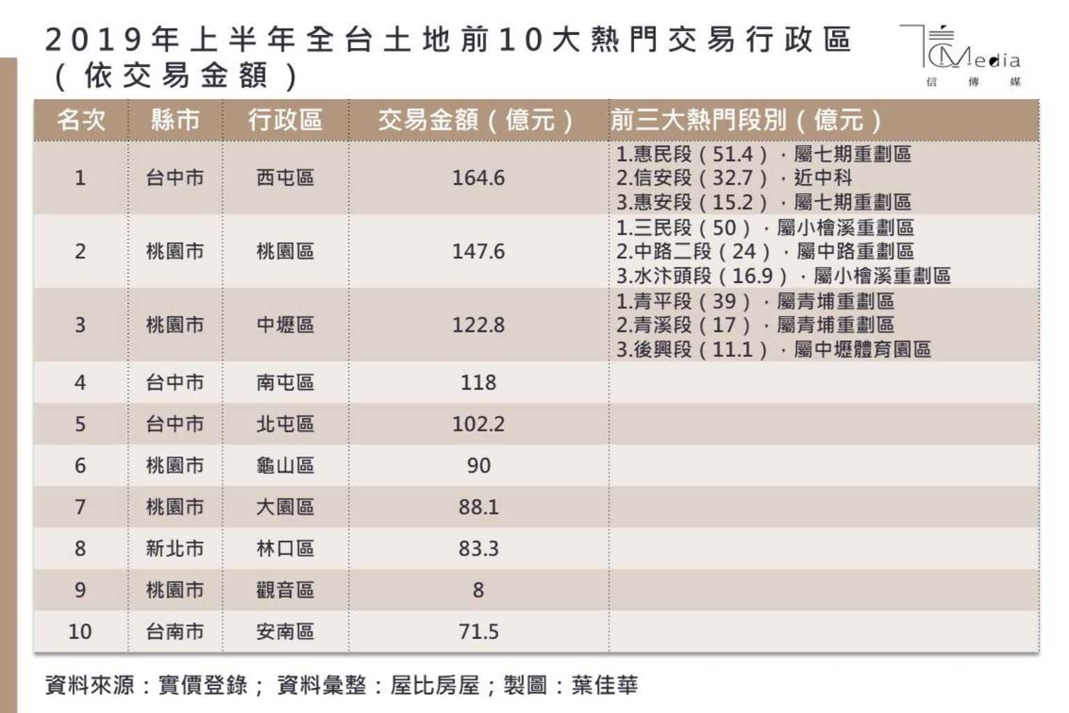 根據實價登錄揭露統計,今年上半年全台土地前10大熱門交易行政區,以交易金額來看,前10名當中包括桃園市的桃園、中壢、龜山、大園、觀音等5個行政區皆躋進前10名,堪稱是這一波購地熱潮中,受惠最多的縣市。