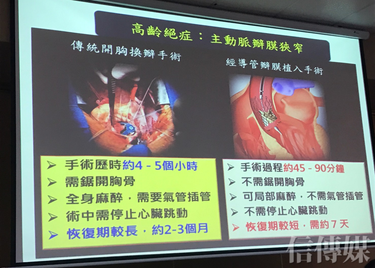 陳嬰華進一步指出,有超過30%嚴重主動脈瓣膜狹窄病人,因為年紀過大或合併其他疾病無法接受手術,「經導管進行主動脈瓣膜植入術較傳統手術侵入性低,傷口小、傷口小,對於接受傳統手術風險太高的病人是一項替代性療法。」