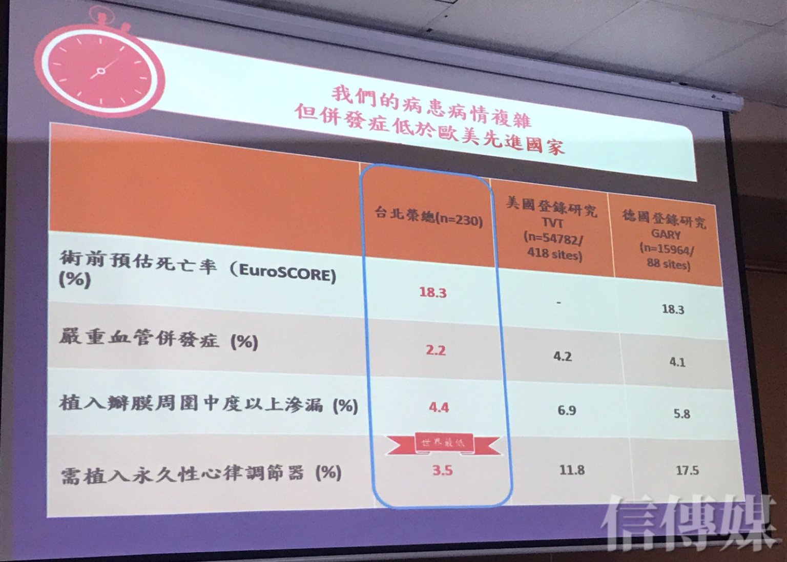 儘管接受此手術的高齡病患平均年齡為81歲,屬於中至高度手術風險患者,但北榮TAVI團隊創造出手術100%成功植入瓣膜,術後30天存活率為100%,高於世界平均值;術後30天內中風、嚴重出血及植入瓣膜周圍中度以上滲漏等併發症發生率為0;且術後只有1.5%的患者需植入永久性心律調節器,遠低於世界平均值。陳嬰華也強調,團隊是在心臟內外科、麻醉科、放射科及神經內科等多專科的密切合作下才有這樣的優異成果。