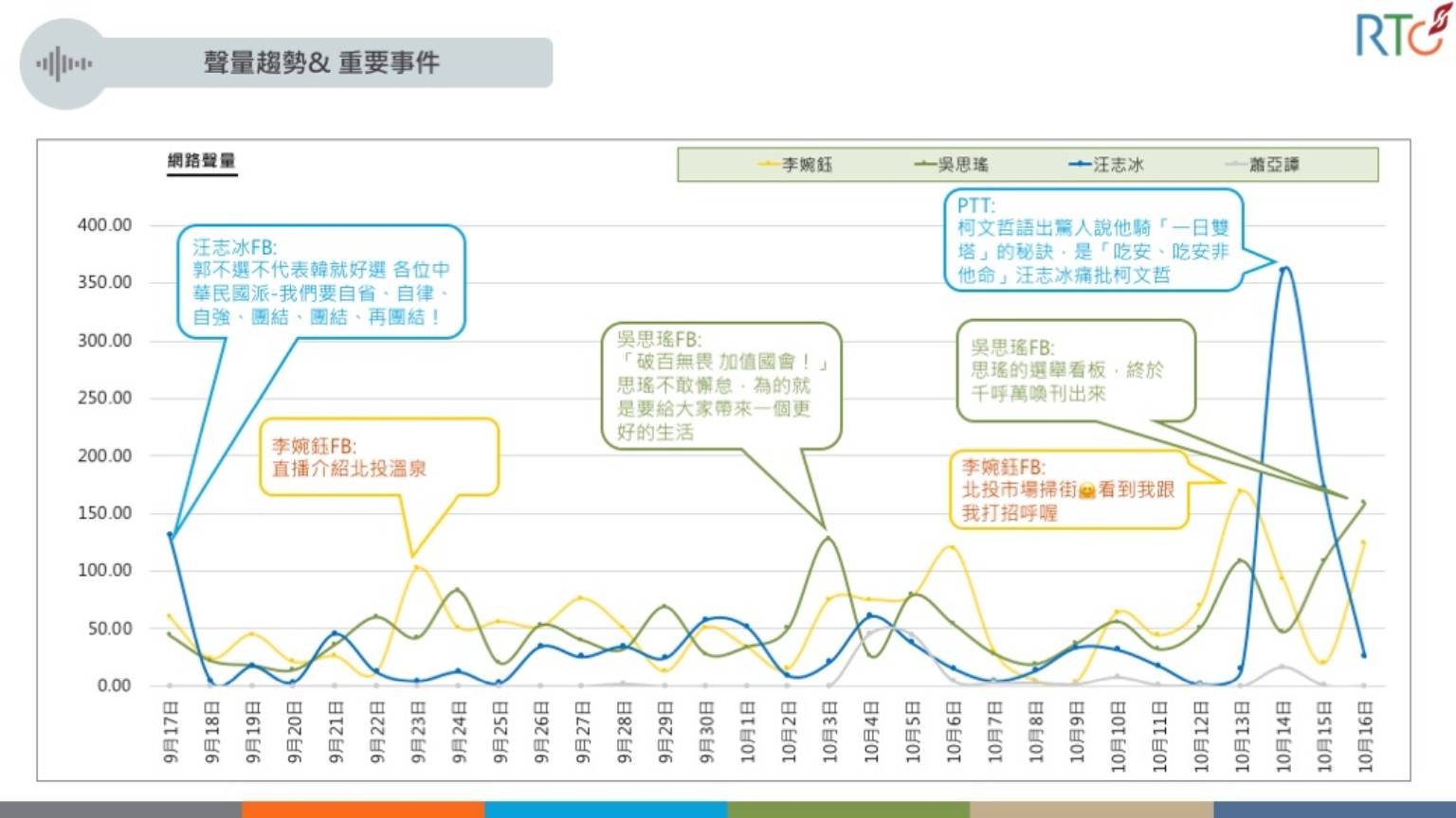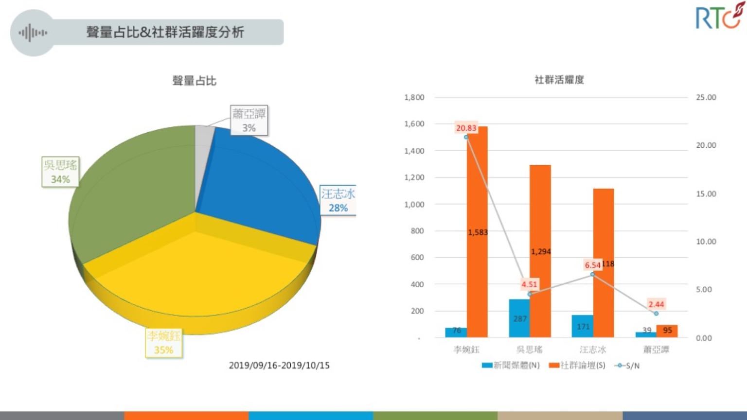 觀察候選人社群活耀度,李婉鈺的FB粉絲數量最高,聲量來源主要也來自社群討論,所以社群活耀度(S/N)明顯高於其他兩人。跨區挑戰的李婉鈺是否能藉話題性空戰帶動支持度,值得觀察。