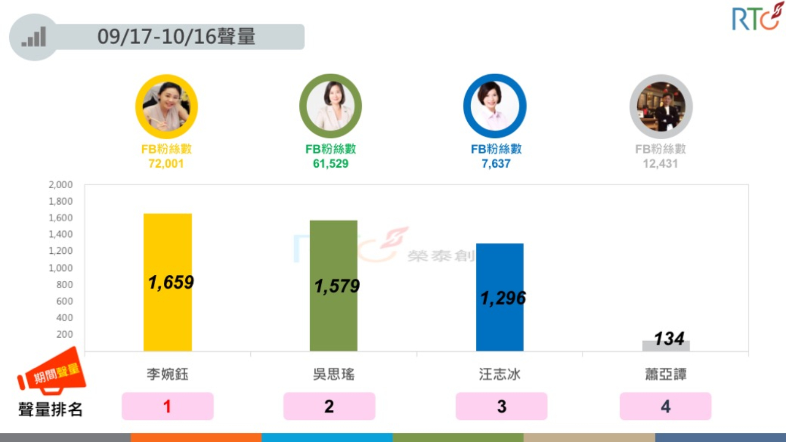 根據《榮泰創數據》觀察近一個月的網路聲量,現任立委吳思瑤網路聲量略低於李婉鈺,汪志冰的FB粉絲數雖明顯落後,但網路聲量只落後前兩位6%-7%。