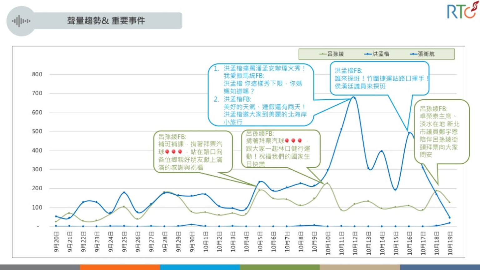 而呂孫綾一直到10月19日,在臉書PO出與民進黨主席卓榮泰、新北市議員鄭宇恩一同在淡水掃街向大家問安的最新動態,網路聲量才超過洪孟楷。