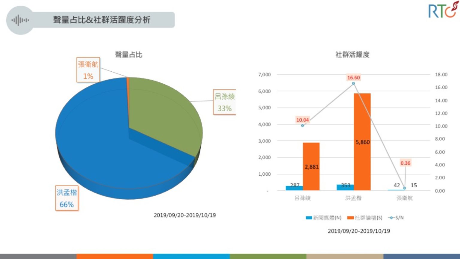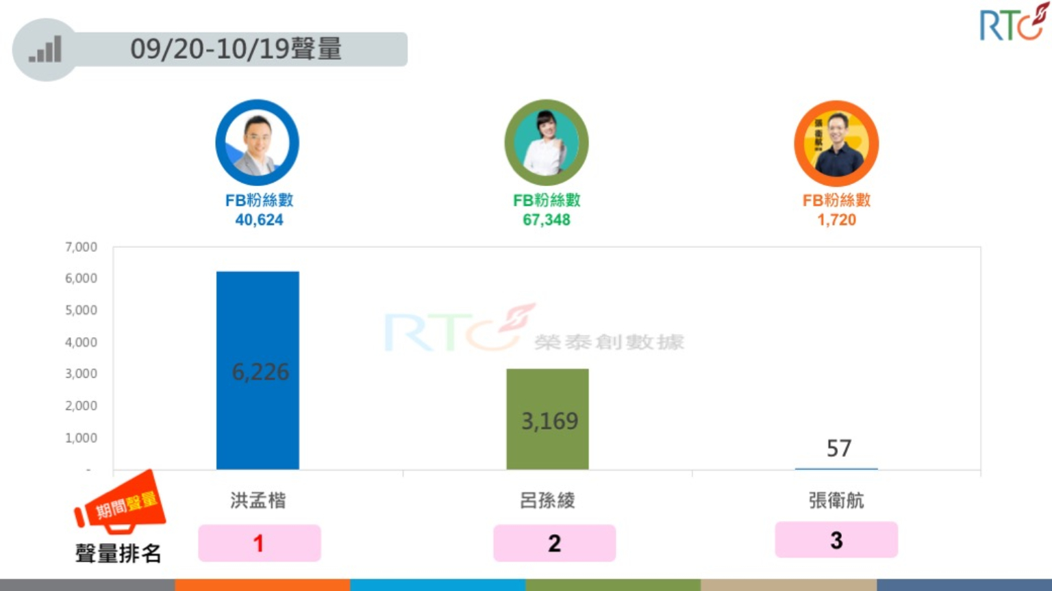 從《榮泰創數據》近一個月聲量分析來看,洪孟楷都是明顯一路領先呂孫綾的趨勢,張衛航的聲量僅佔1%相對弱小,洪與呂兩人聲量差距最高點在10月11與12日,當天洪孟楷在FB痛罵屏東縣長潘孟安辦煙火秀,洪頻頻創造網路話題,引發網友熱議。自9月20日至10月19日的累積聲量,洪孟楷總聲量是呂孫綾的兩倍。