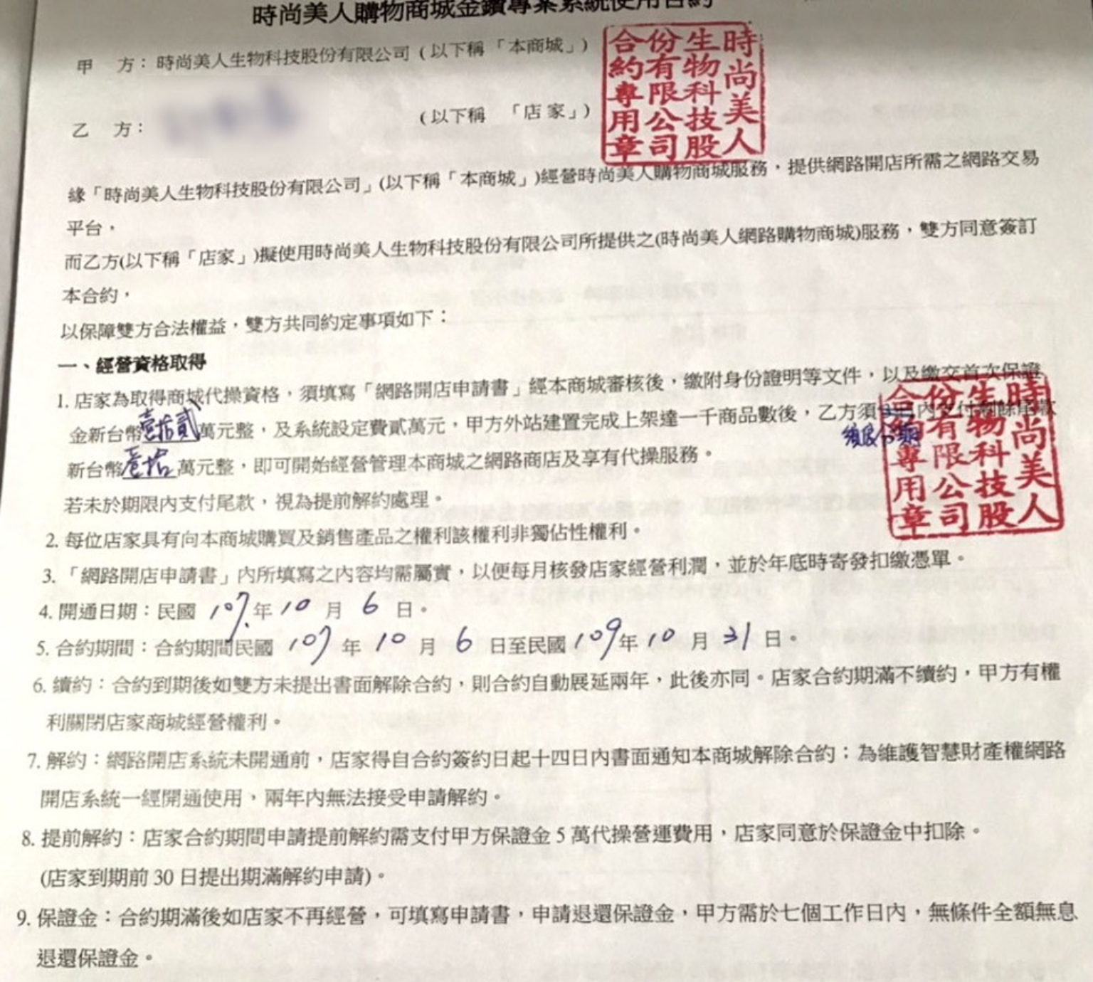 楊律師原本以為時尚美人會倒,是因為比不過奇摩、PCHOME、還有蝦皮,受害者若打求償官司應該沒有勝算,不過在他把契約仔細看了一遍後,發現這不單純只是投資失利而已。