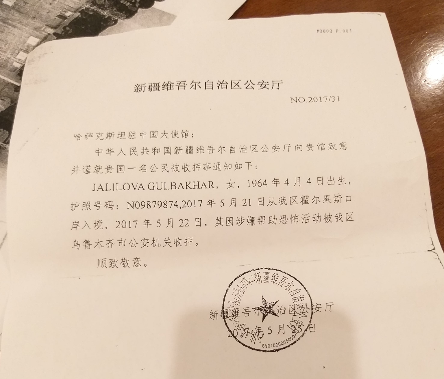 新疆維吾爾自治區公安廳給哈薩克駐中國大使館,關於逮捕Gulbahar的通知。(攝影/洪培英)