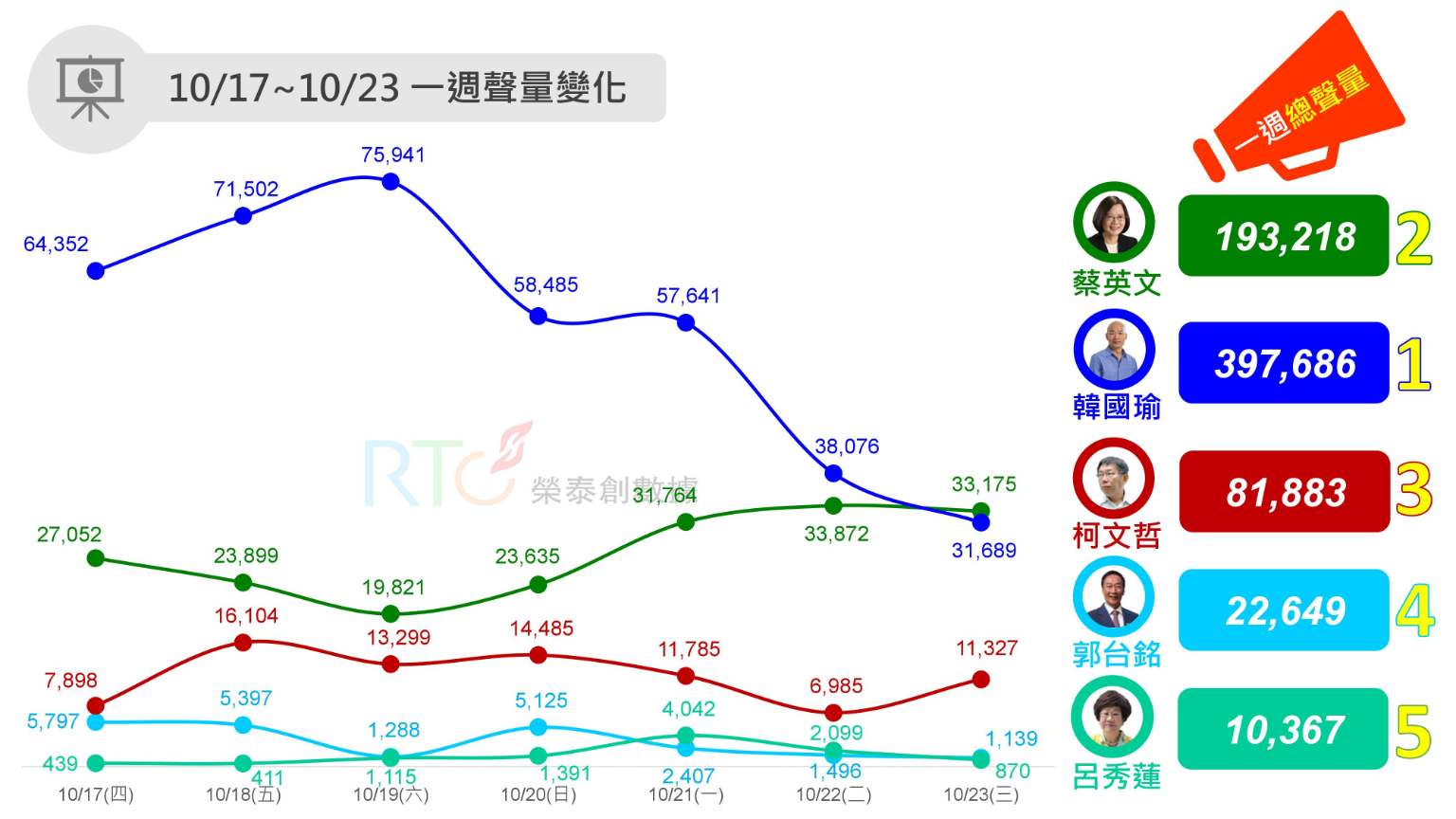 根據《榮泰創數據》提供的一週總統參選人聲量,高雄市長韓國瑜從開始放「韓假」後,每天的網路討論度都相當高,一日能到6、7萬則聲量,遠超越其他政治人物。