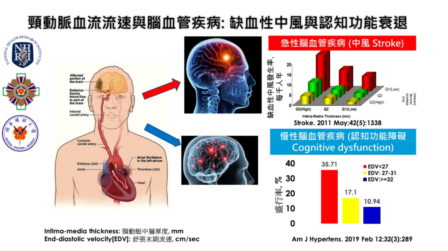 「頸動脈流速除了長期可預測中風的發生,流速低不只跟急性腦血管疾病有關,也反應大腦中血管的循環跟其他結構的功能,知道這些相關性就能提早去做預防。」國家衛生研究院群體健康科學研究所副研究員莊紹源指出。