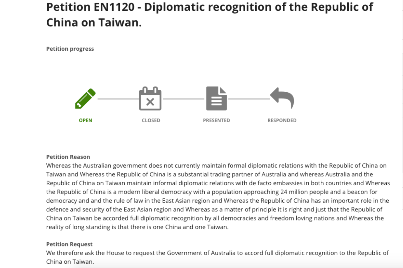 據報導,署名Gavan Daffy的澳洲民眾,提出「請眾議院要求澳洲政府,對台灣給予充分的外交承認」請願案(EN1120號),內容指出,「雖然澳洲政府目前未與台灣保持正式的外交關係,但台灣是澳洲的主要貿易夥伴,因此,澳洲和台灣使館之間維持的是非正式外交關係。」