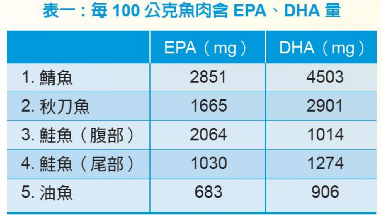 (1)EPA、DHA主要來自深海中魚類。如:鮭魚(野生含量較多)、鮪魚、沙丁魚、鯖魚、 鯡魚、秋刀魚等。