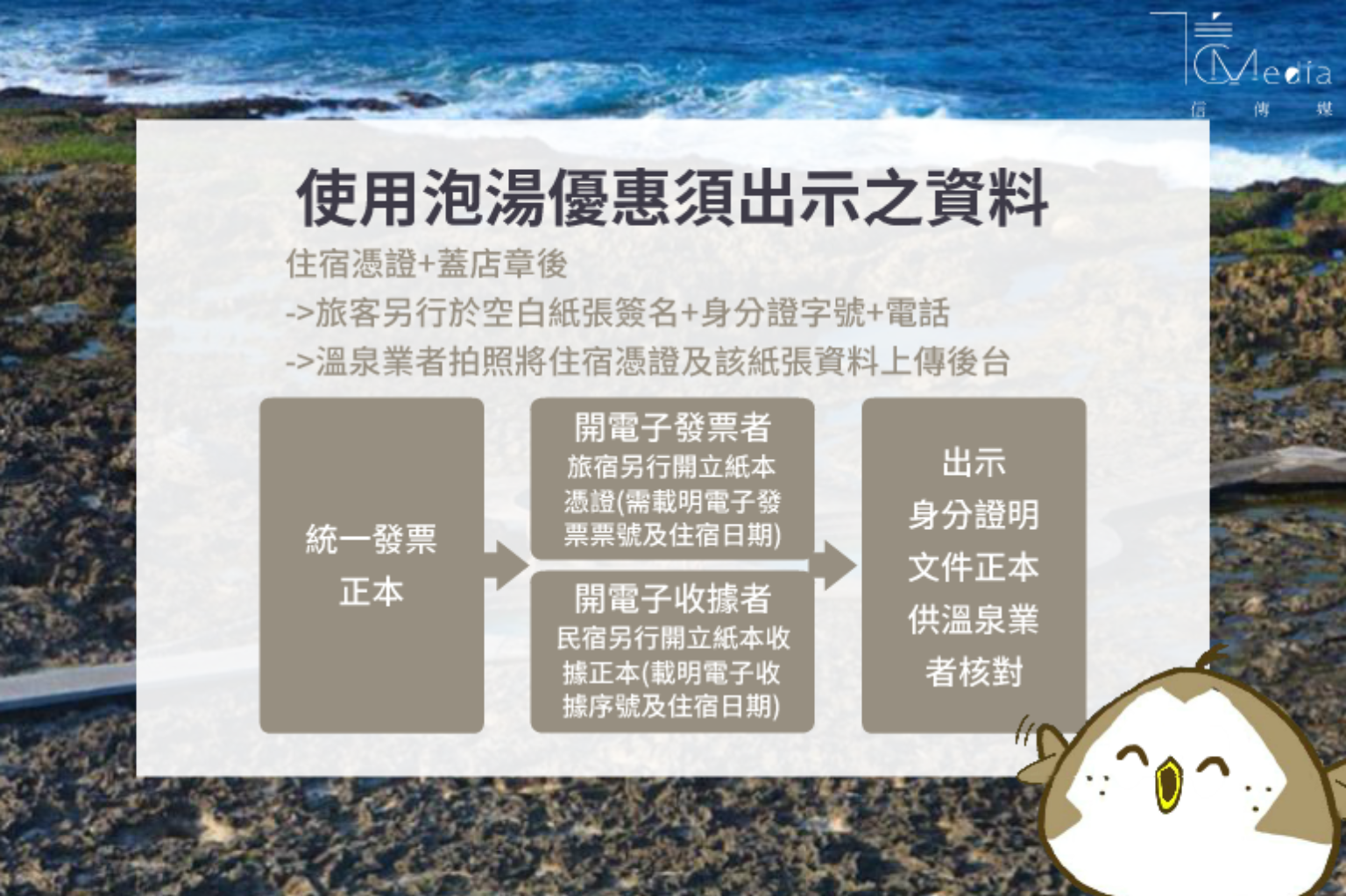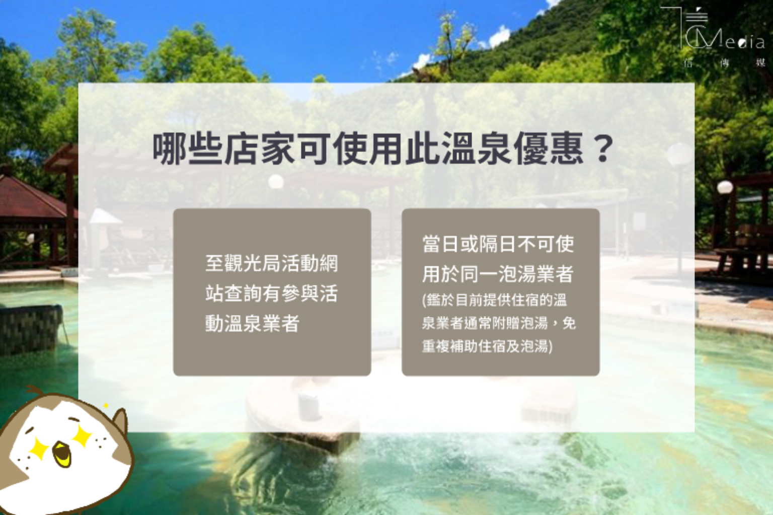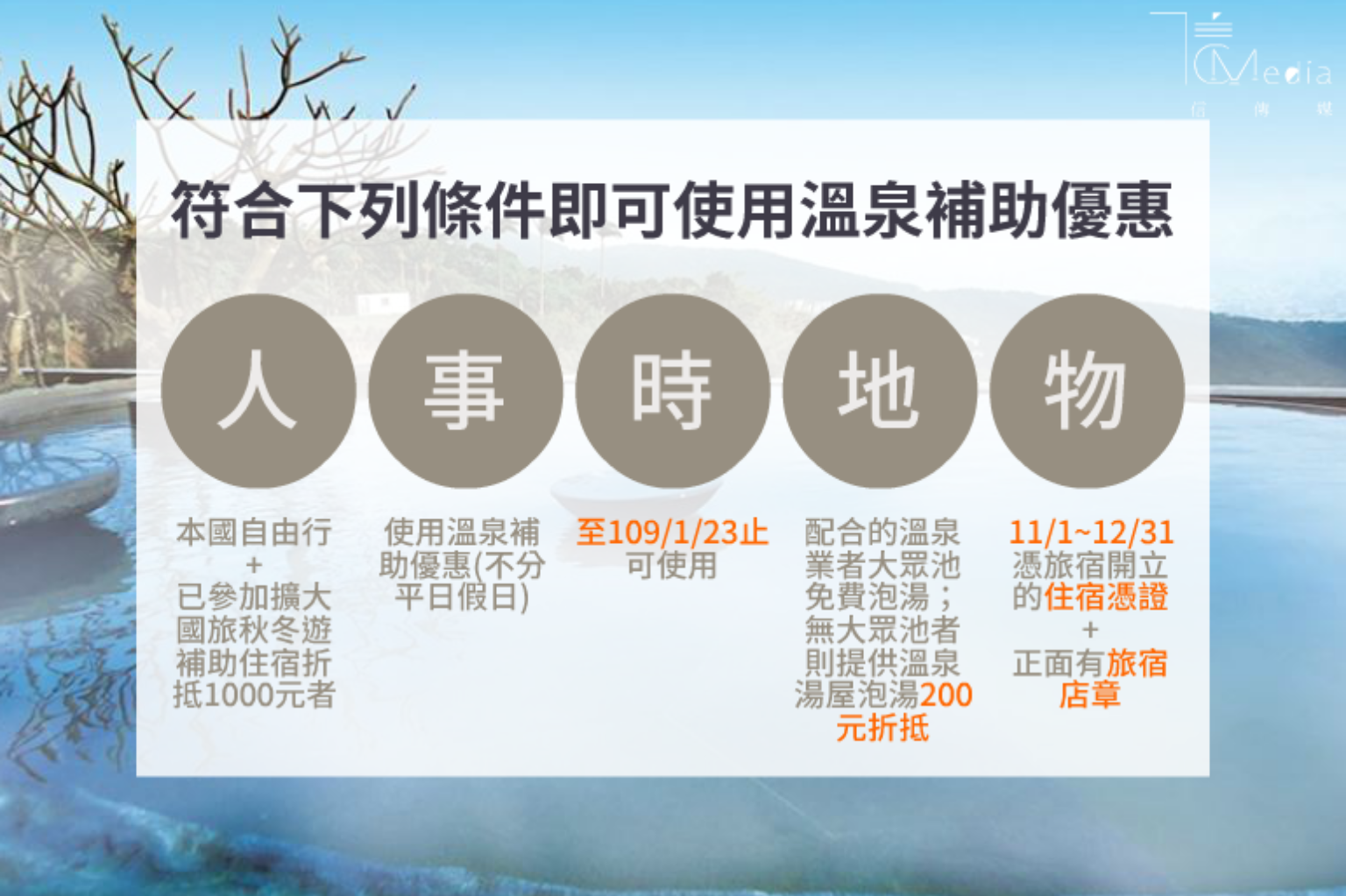 交通部觀光局宣布推出「擴大國旅秋冬遊溫泉優惠活動」,只要是參加秋冬遊補助住宿優惠活動的本國自由行旅客,且已申請並折抵1000元者,在108年11月1日起至12月31日期間,憑上旅宿業開立的住宿憑證加上其住宿店章,即可於109年1月23日前,即可使用溫泉補助優惠,包含可至配合的溫泉店家大眾池免費泡湯,或是無大眾池者最高可折抵200元優惠使用溫泉湯屋1次。另外注意,使用本活動者,不可於當日或隔日於同一業者泡湯使用,避免與溫泉業者住宿贈送泡湯的優惠重複。