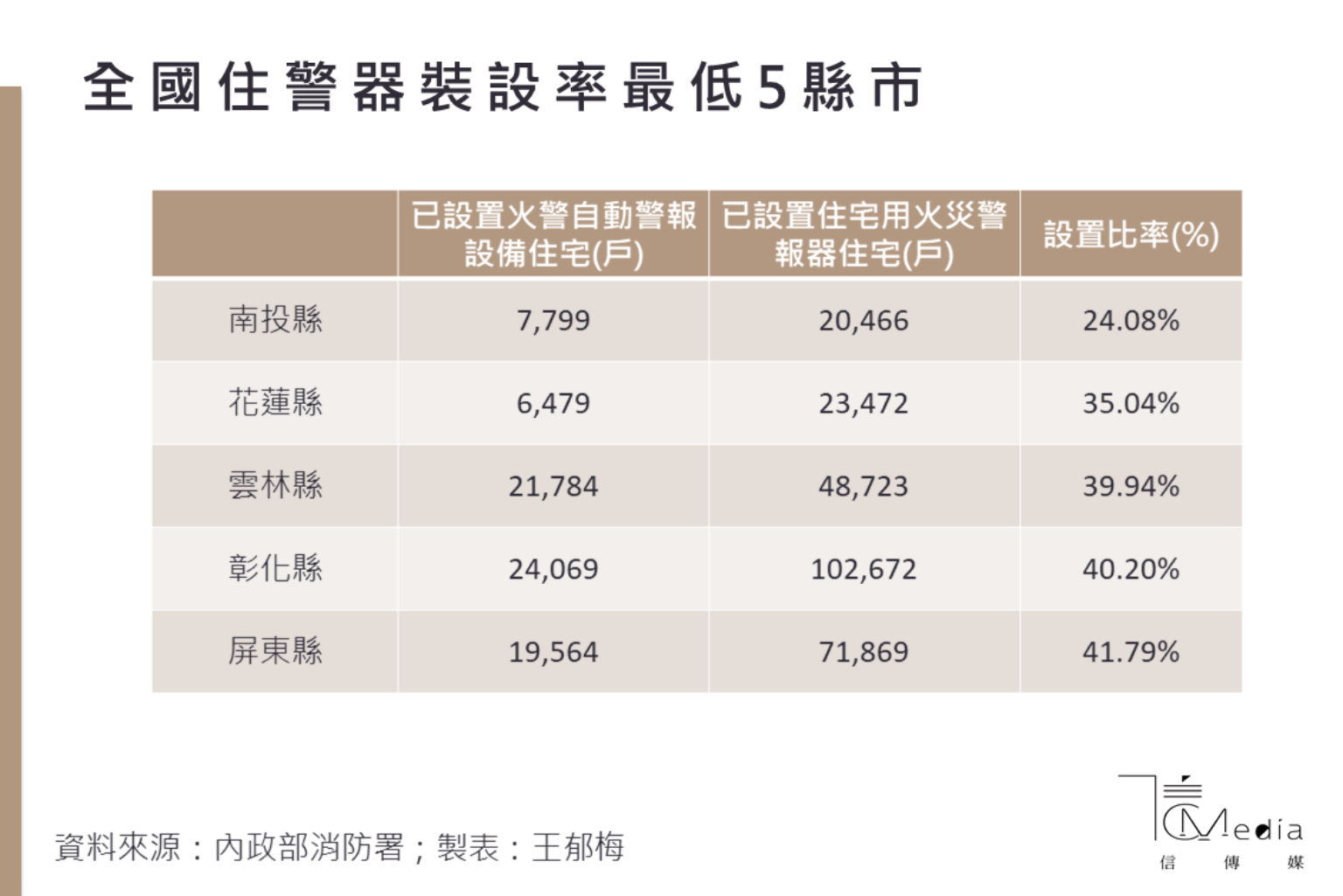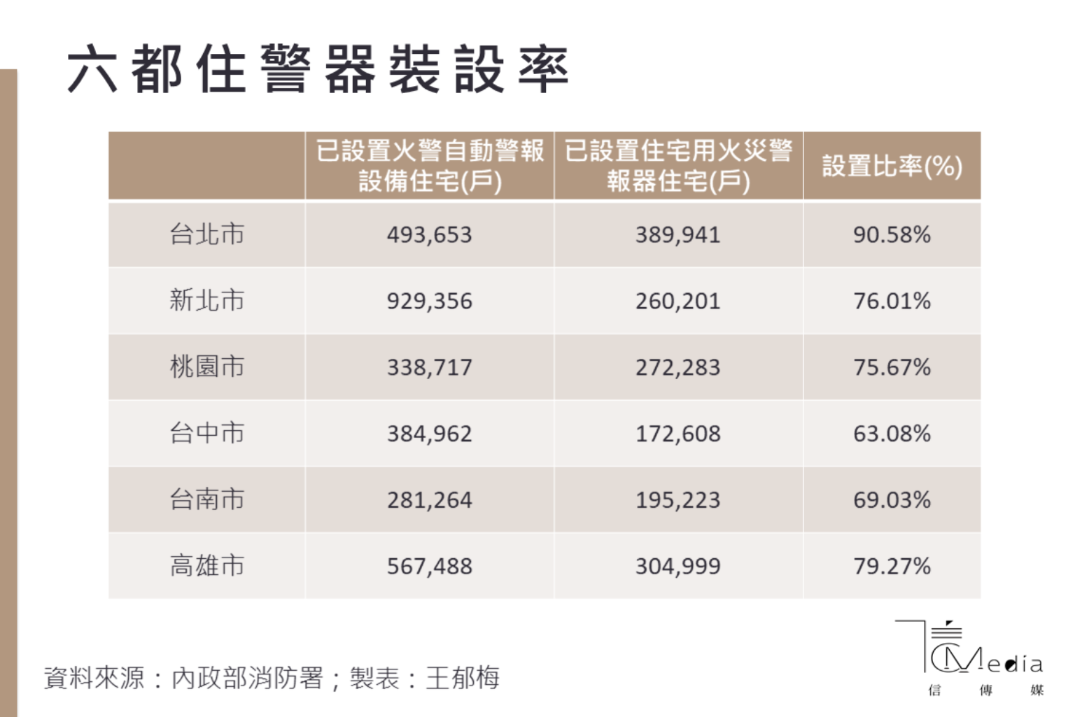 截至今年9月的統計資料顯示,全國住宅場所火災警報器裝設比率為71.4%,六都還有兩個縣市未達平均,分別是台南市的69.03%和台中市的63.08%。