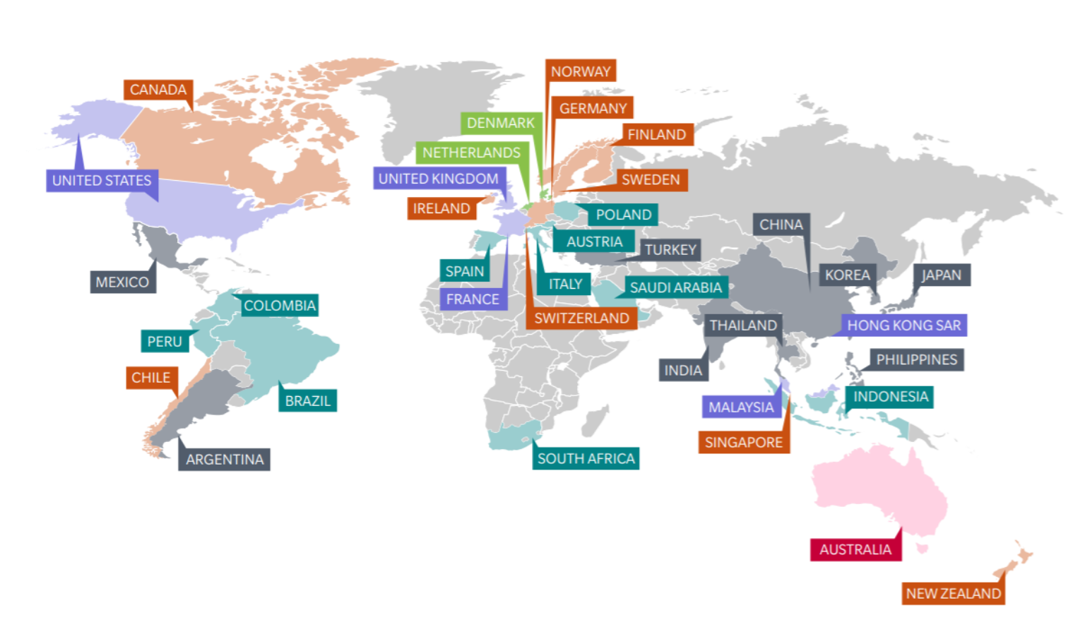 「模範生」荷蘭和丹麥同列A等,代表它們提供退休者最堅實的保障。次一級有歸於B+的澳洲,以及B等的瑞典、挪威、新加坡、紐西蘭、加拿大和智利為B等。