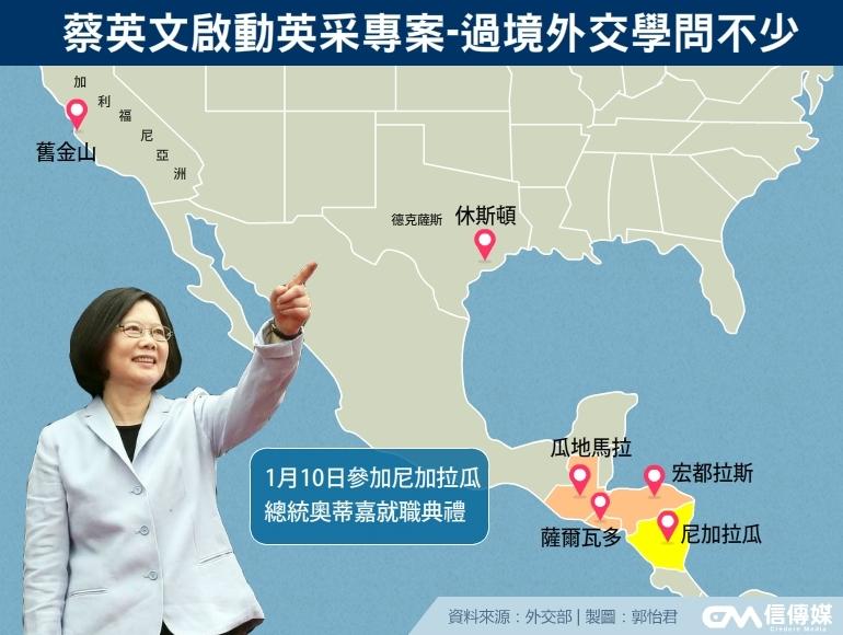 蔡英文總統明年1月將出訪中美洲,主要是參加尼加拉瓜總統奧蒂嘉1月10日的就職典禮,並順道訪問瓜地馬拉、薩爾瓦多及宏都拉斯,飛航途中過境美國停留城市,預定是德州休士頓與加州舊金山,這兩大城市台僑不少,蔡英文能停留多久,到達那些會場,會見什麼人士,外交與國安單位正在安排。