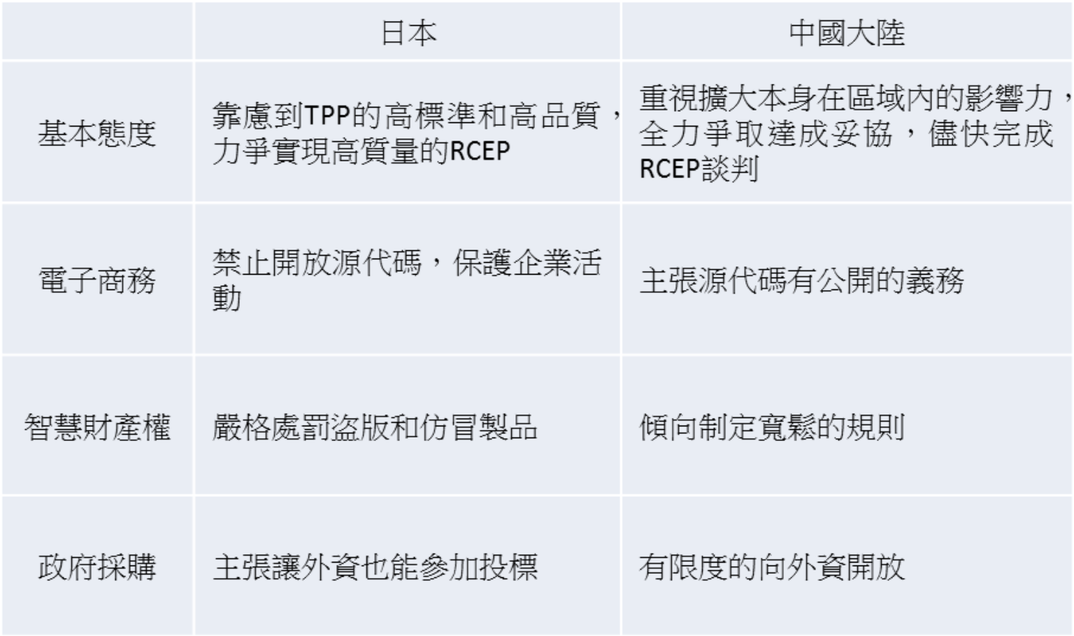 檢視RCEP談判進程一再延誤,主要是談判涉及16國,各國經濟發展差異較大,有已開發國家的日本、澳洲和新加坡,新興市場國家的中國大陸和印度,還有開發落後的緬甸、寮國、柬埔寨,基本上要很快談判達成一個高水準的RCEP並非易事。