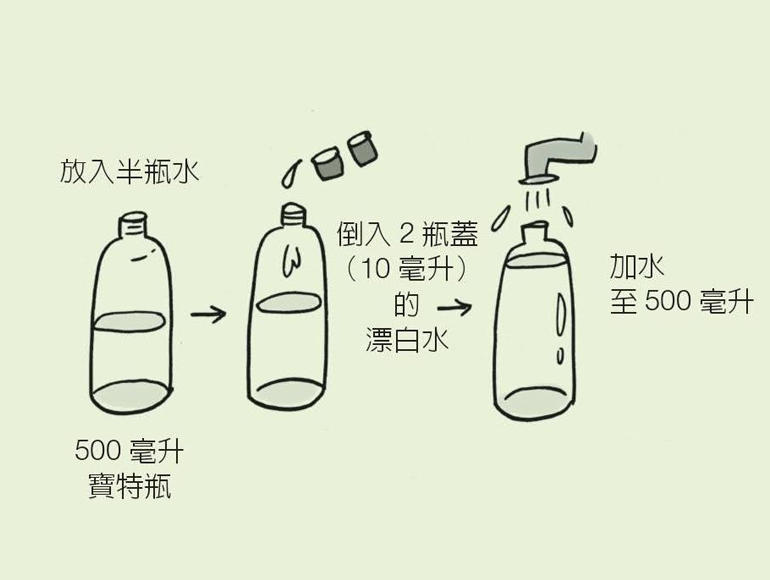 如果想要消毒地板、衣服或廁所,只要在五百毫升的寶特瓶裡先裝一半的水,再倒進兩瓶蓋的漂白水(十毫升),最後加水至滿五百毫升的容量即可。如果是要消毒雙手會直接碰觸的地方或玩具等物品,則是在兩公升容量的寶特瓶裡同樣倒進兩瓶蓋的漂白水(十毫升),再加水至滿兩公升的容量。