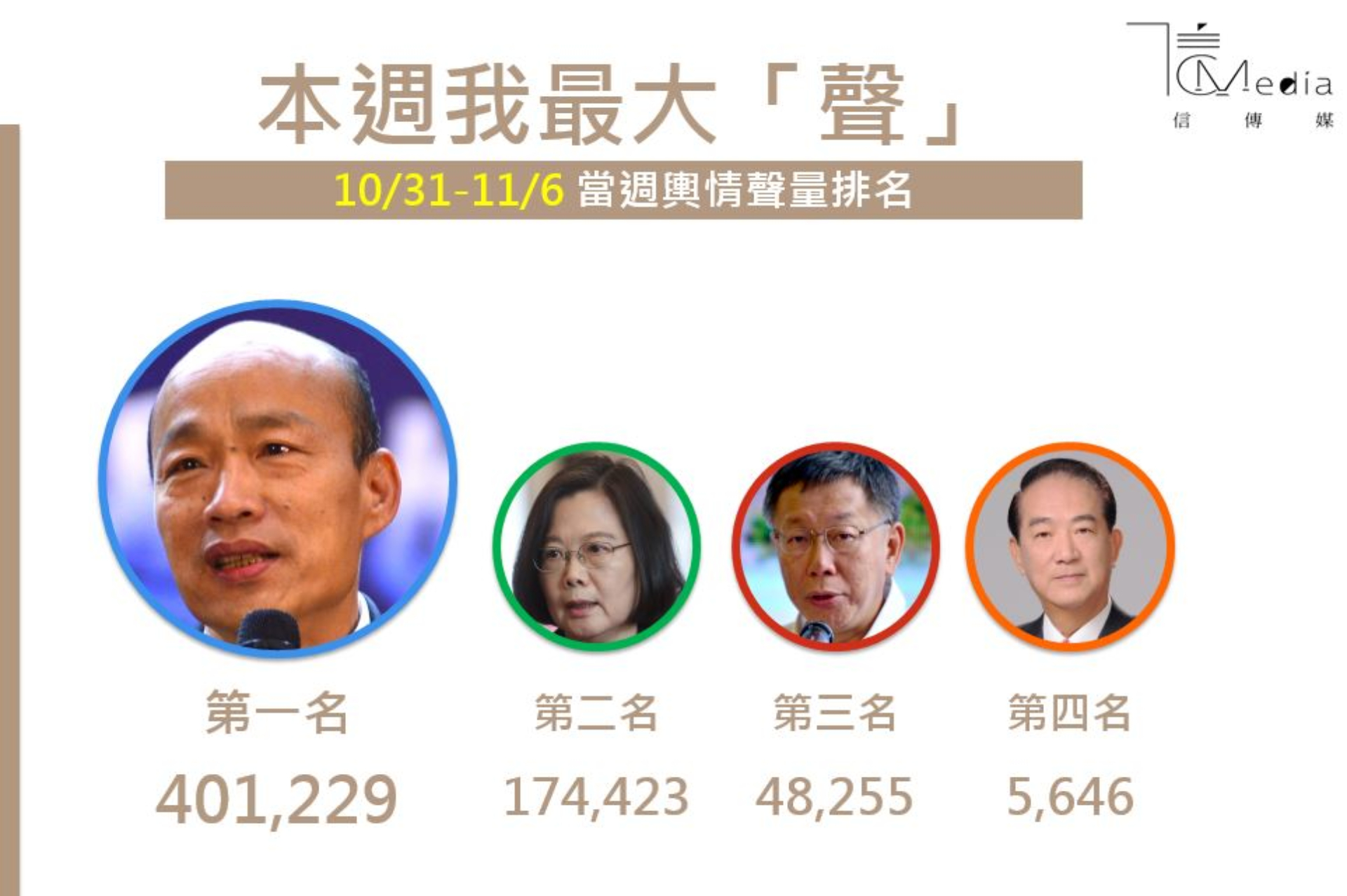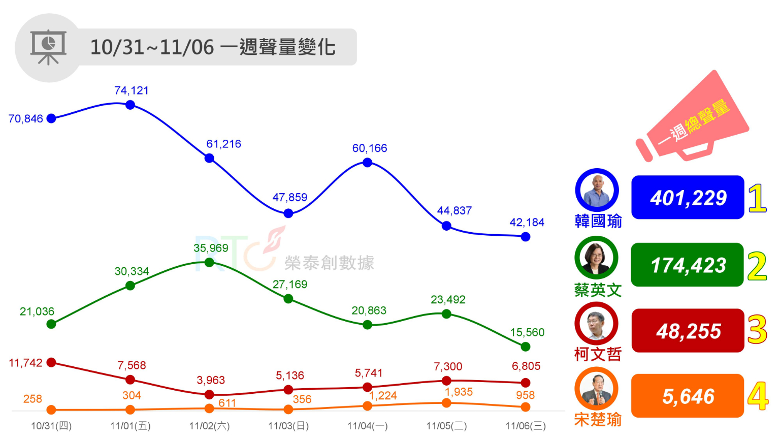 高雄市長韓國瑜再度拿下本週「聲量王」,從10月31日提出學貸免利息政策後,聲量大漲至7萬以上。且外,韓國瑜2日還與前新北市長朱立倫,一同參與台南市立委參選人洪秀柱的競選總部成立大會,讓他超高聲量維持了3天,直到3日才稍微冷卻。