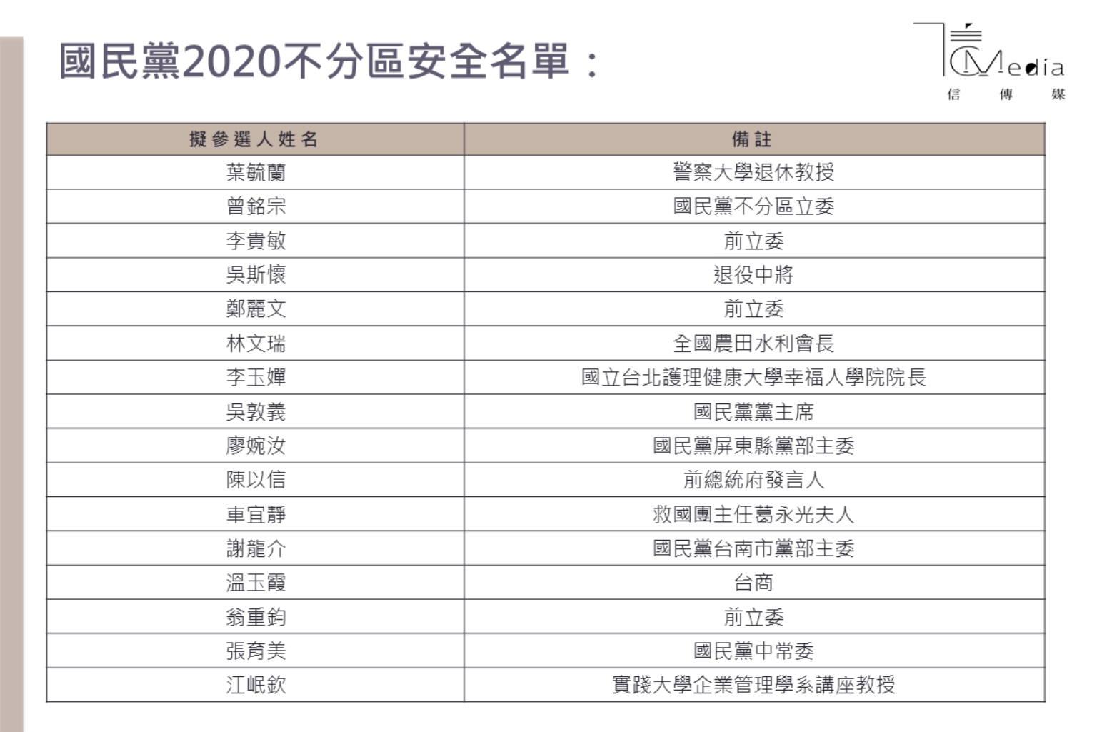 雖然國民黨不分區立委正式名單要到周三才會公開,並於當天中常會核備,在周六由中央委員會行使同意權,不過今(12)日已經有安全名單先行流出,雖然一般預料週六的中央委員會應會順利通過。