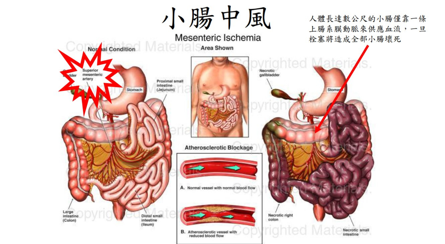 蔡昕霖先解釋,「人體長達數公尺的小腸僅靠一條上腸系膜動脈來供應血流,一旦栓塞將造成全部小腸壞死,沒有徵兆也沒辦法預防,就像中風一樣。因為身體中有一些血栓順著血流跑,有一定機率會塞到小腸,但發生率比腦部中風低很多。」他表示,小腸中風相對容易發生在65歲以上或是有心血管病史的族群。