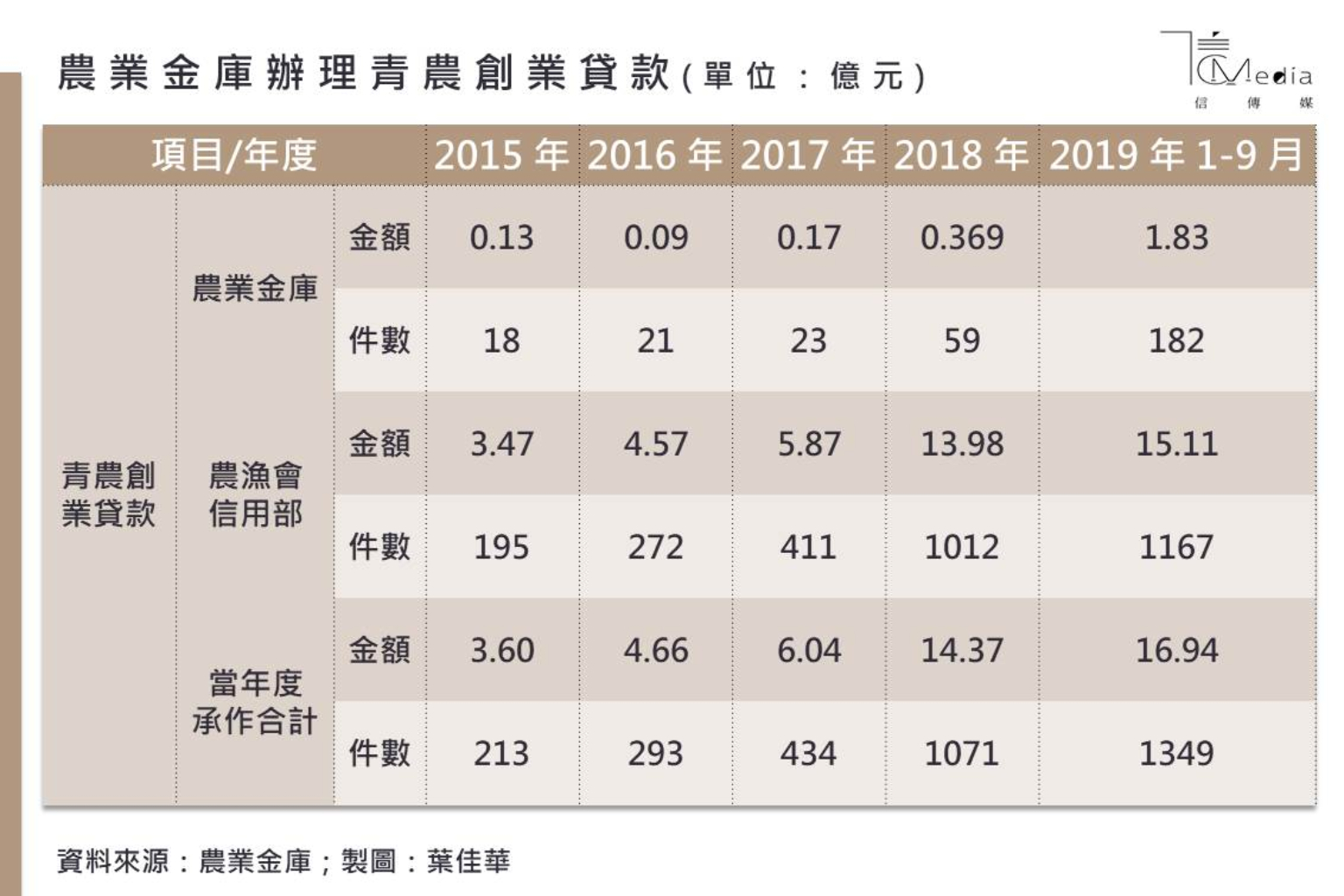 根據農業金庫辦理青農創業貸款統計,加計全台311家農漁會信用部的青農創業貸款金額,從2015年承作總金額3.6億元、承作件數213件,一路逐年提升,2018年全年承作金額已來到14.37億元、件數破千件,甚至在2019年的前9個月,就已超過上一年全年記錄,承作金額攀升至16.94億元,承作案件達到1349件。