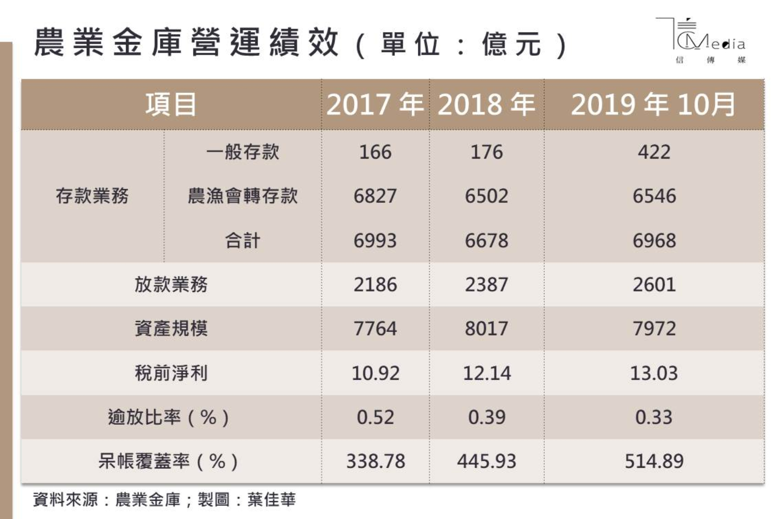 攤開農業金庫的營運概況,放款餘額從2017年底的2186億元,成長至今年10月底的2601億元;稅前淨利部分,截至今年10月底為止,已達13.03億元,已超過2017、2018年的全年紀錄;至於逾放比則是持續減少,從2017年底的0.52%,降至今年10月底的0.33%。