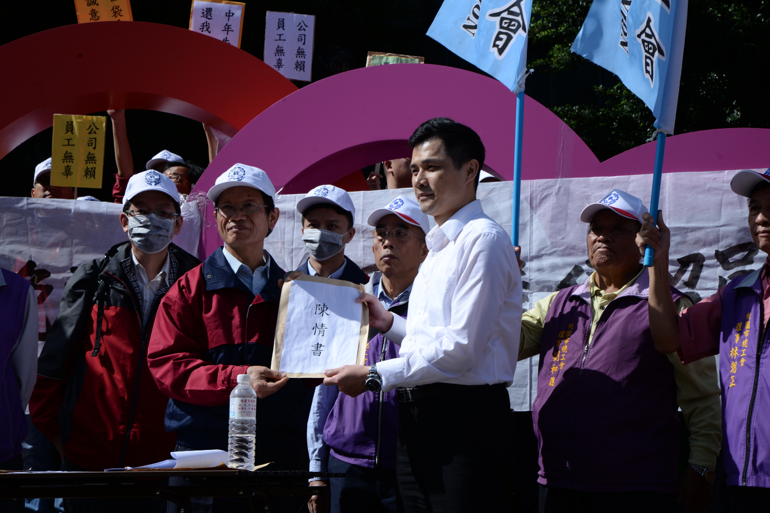 華映企業工會理事長蘇國哲(左)遞交陳情書給大同公司代表。(攝影/趙世勳)