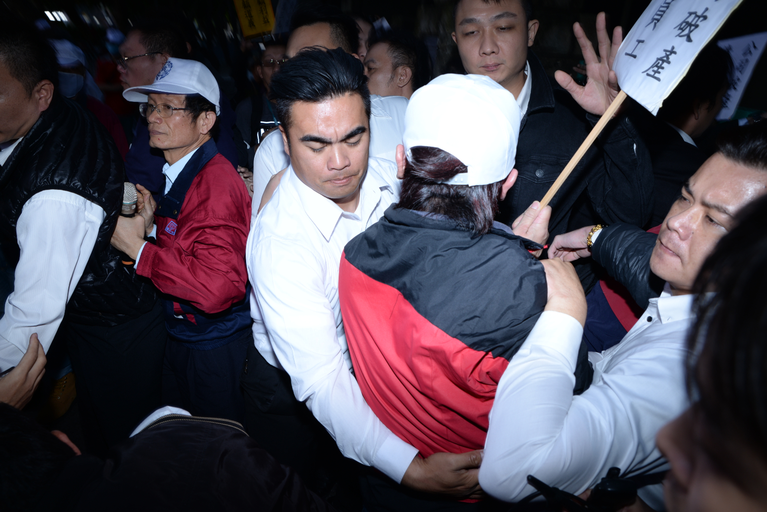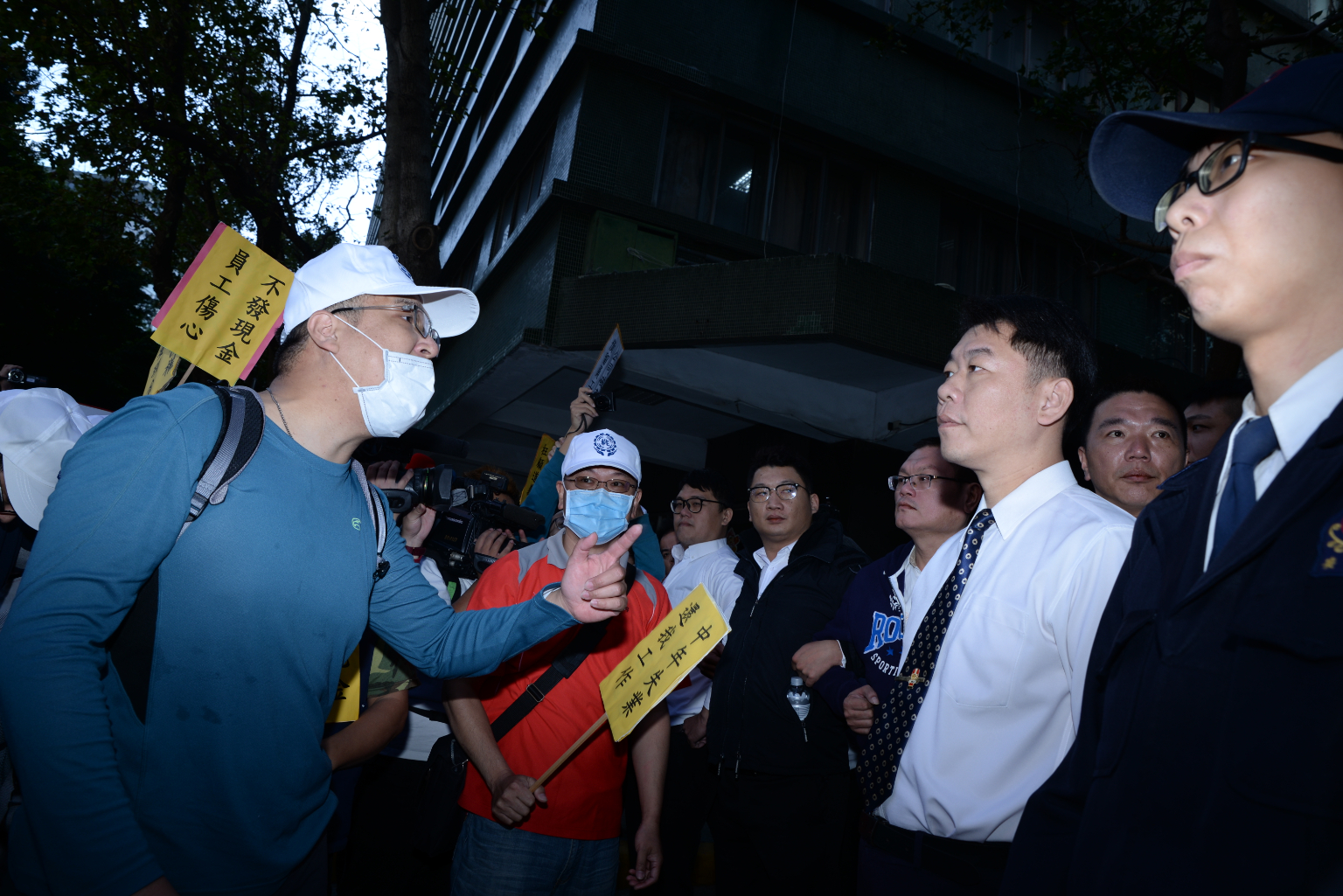 在蘇國哲帶領下,衝進公司門口說員工要「進公司上廁所」與警衛擋在門外爆發衝突(攝影/趙世勳)