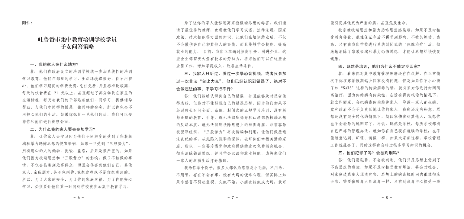 這份《問答策略》翻來覆去強調「免費、安全、幸福」等字眼,用一種施恩的口吻表示,「你家人在學校參加教育培訓,不僅學語言、學技能,不用自己掏錢,而且連吃飯、穿衣、住宿、用水、用電甚至看病,都是由政府全部承擔」。