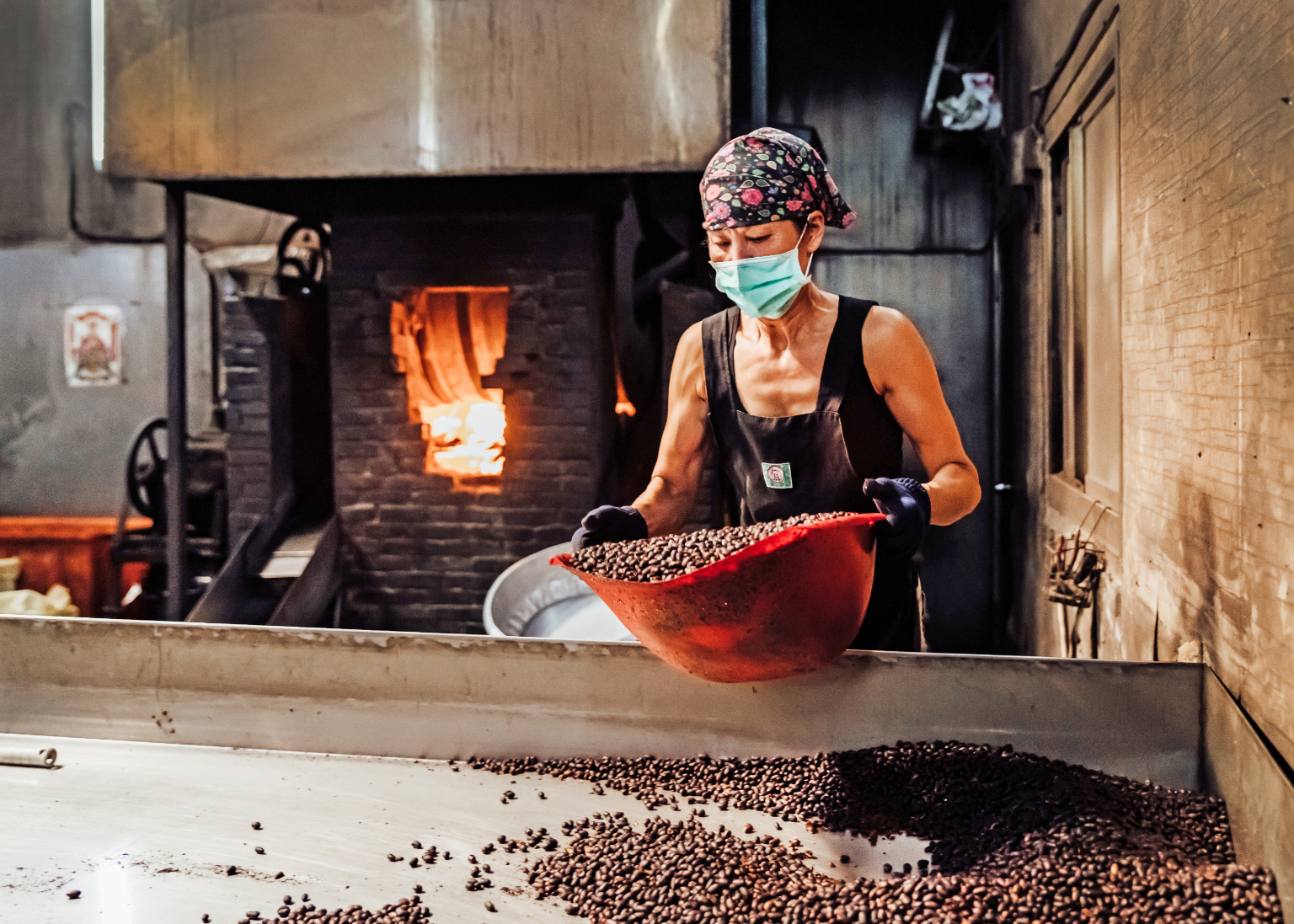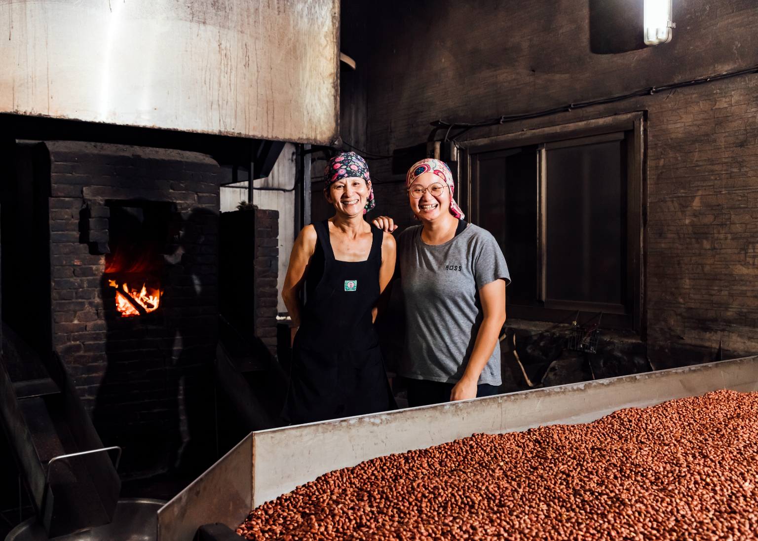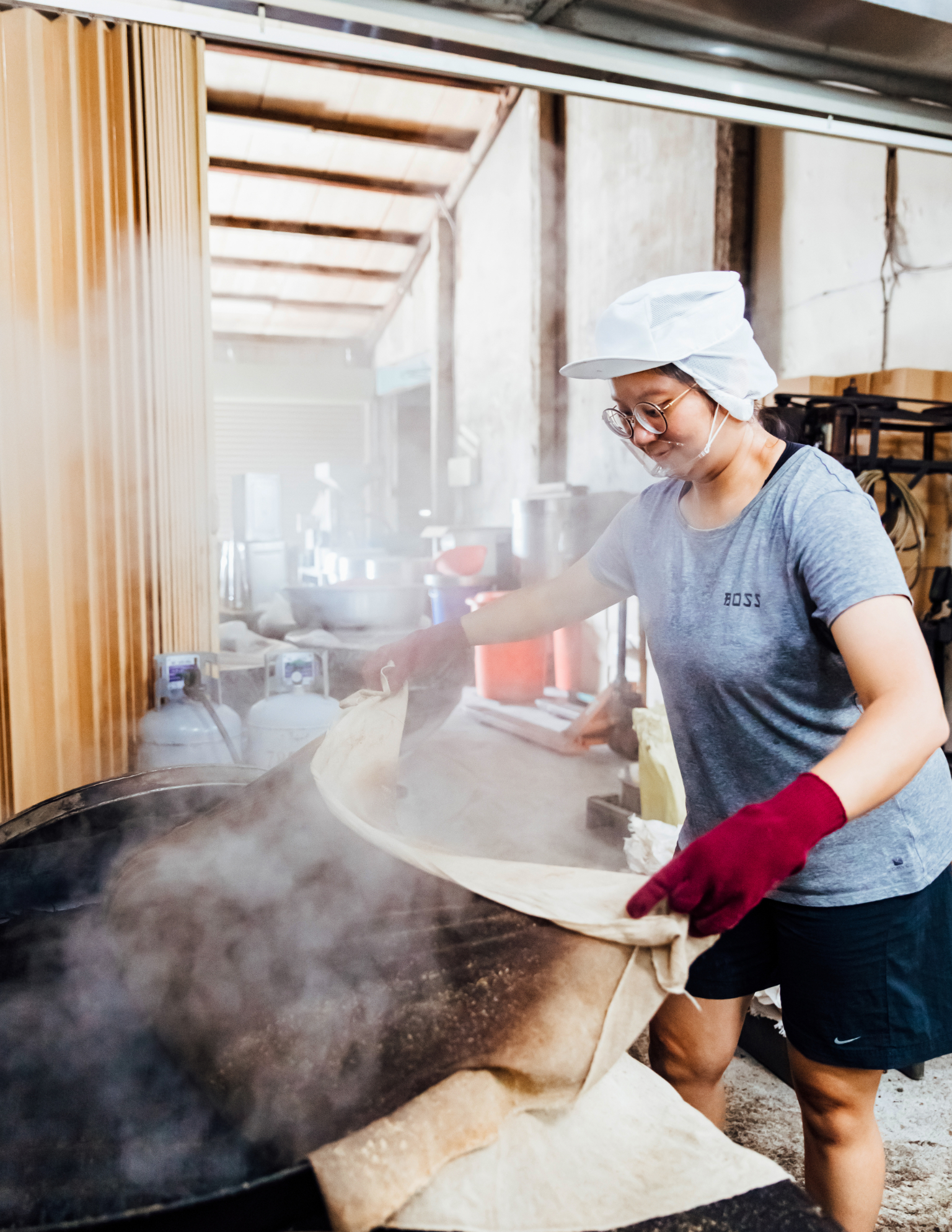 進入榨油重地,磚灶柴火熊熊燃燒,悶熱空氣中瀰漫著濃郁的炒花生香氣。金弘目前由黃筑憶的媽媽、人稱阿霞的許玉霞掌鍋,纖瘦而精壯的她,成天耐著高溫,掌控油料的焙炒狀況。看似單純且重複的粗活,其實是榨油精髓,每種作物的焙炒溫度與時間皆不盡相同,甚至每一批作物的條件也不一樣,這些細微變化,全憑掌鍋人的經驗判斷。