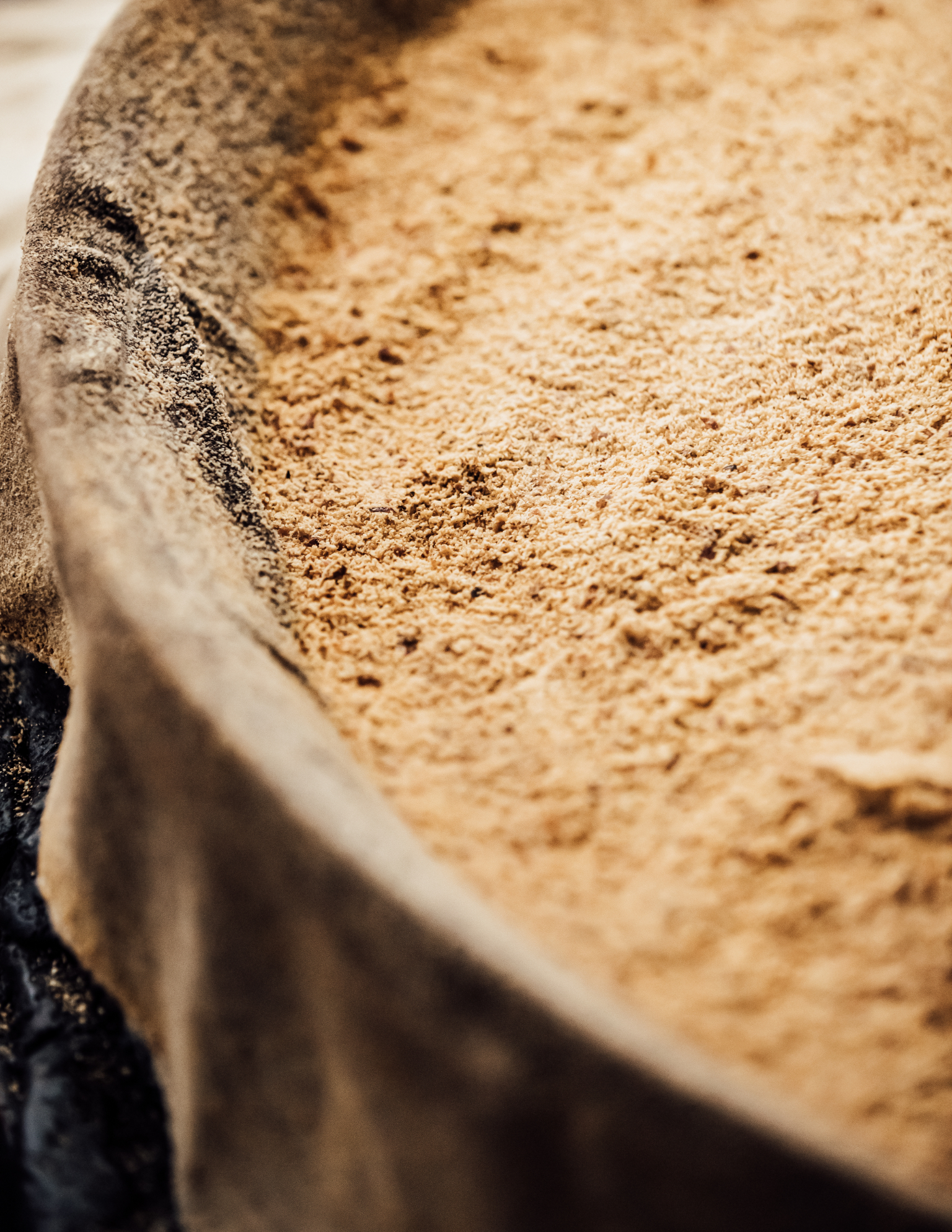 剛焙炒完的油料質地軟、溫度高,無法立即碾碎。需要等待冷卻,隔天再用機器碾碎成粉末,使原料變得更細緻、容易出油。金弘目前有用花生、黑白芝麻、油茶籽榨油,碾碎機器都不一樣。