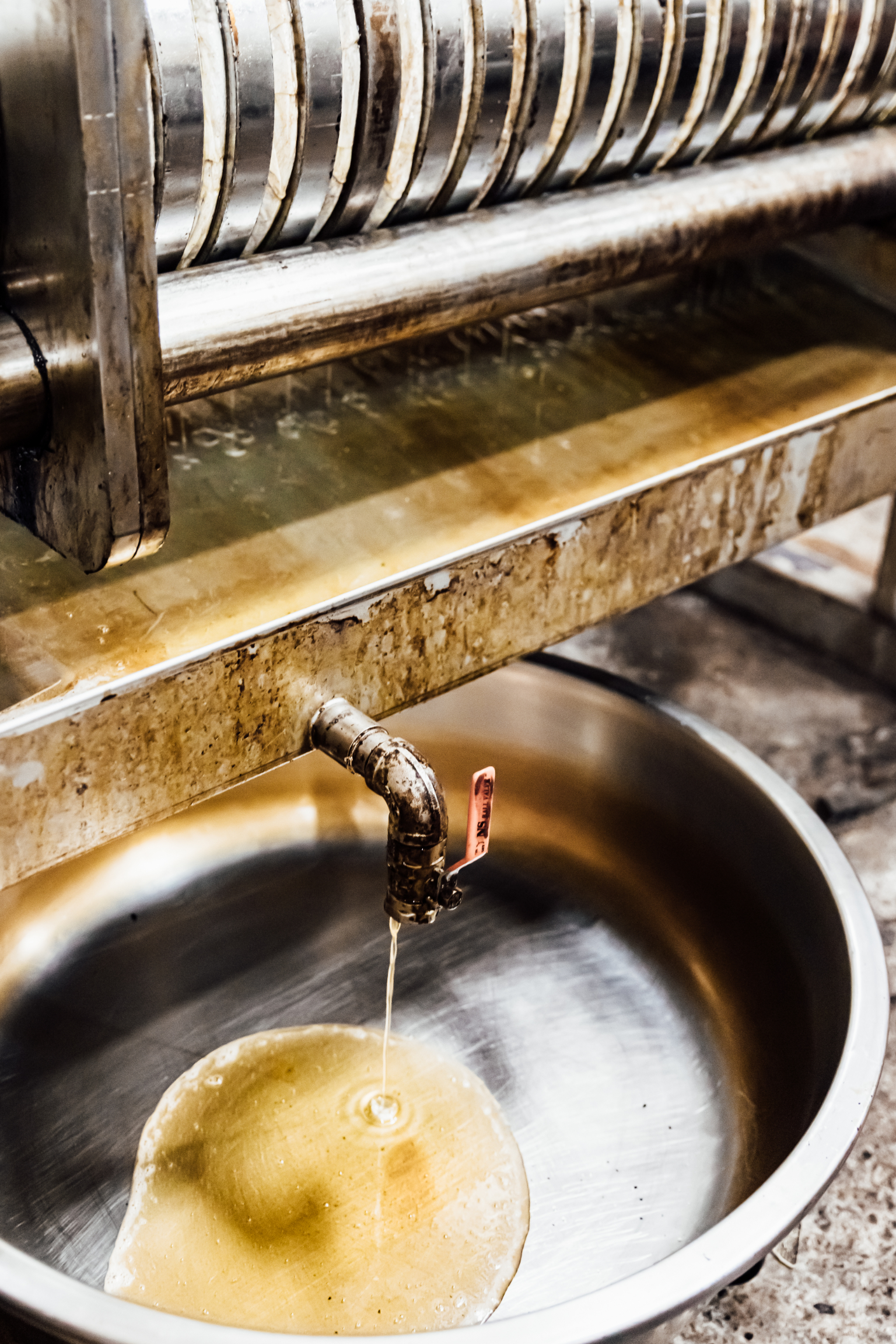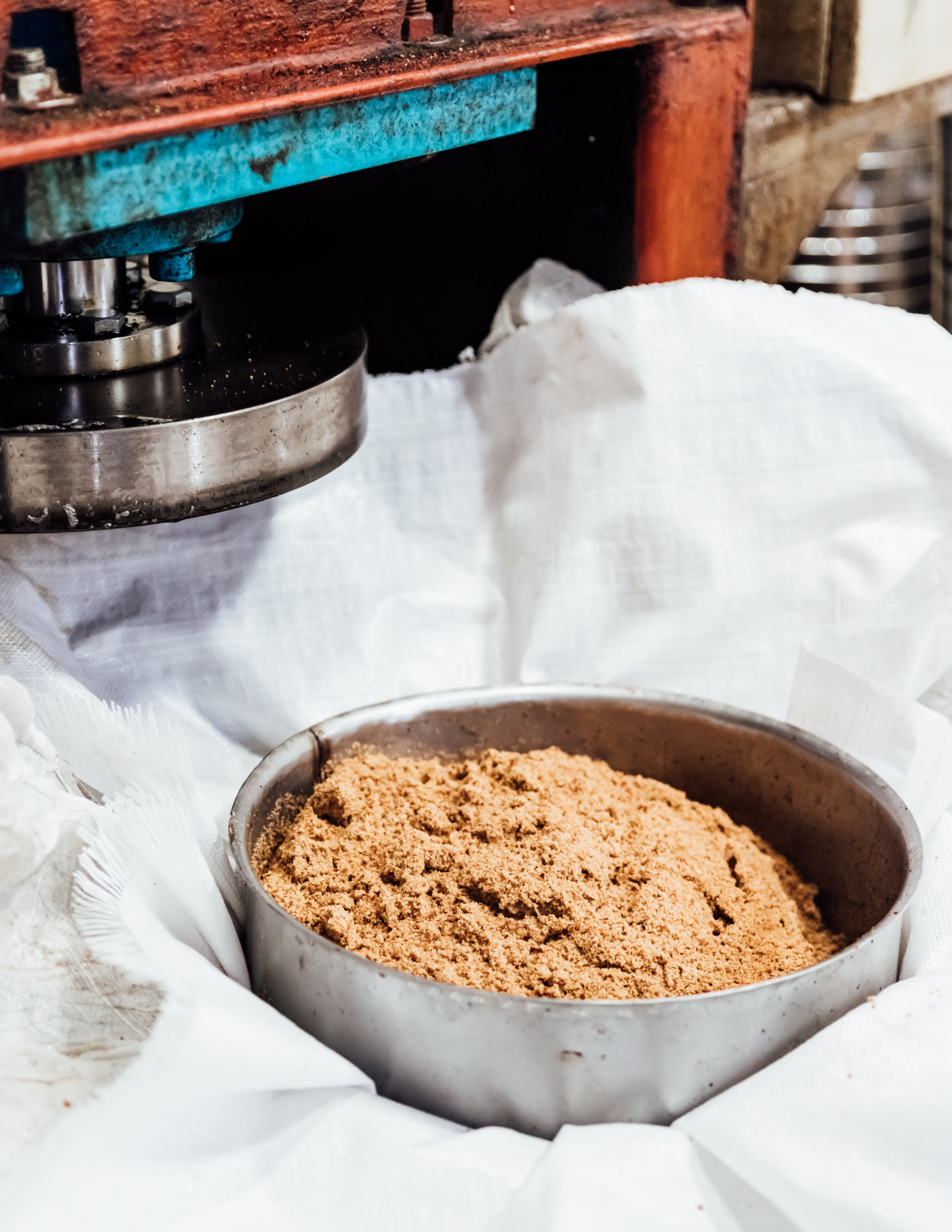 將油餅一片片豎立排放,啟動榨油機,透過油餅相互擠壓的壓力,榨出油料內含的油脂。油餅需壓榨24小時,初榨而成的植物油會殘留原料的細渣,不能立刻裝瓶販賣,要先靜置沉澱一至兩週,才能賣給消費者。