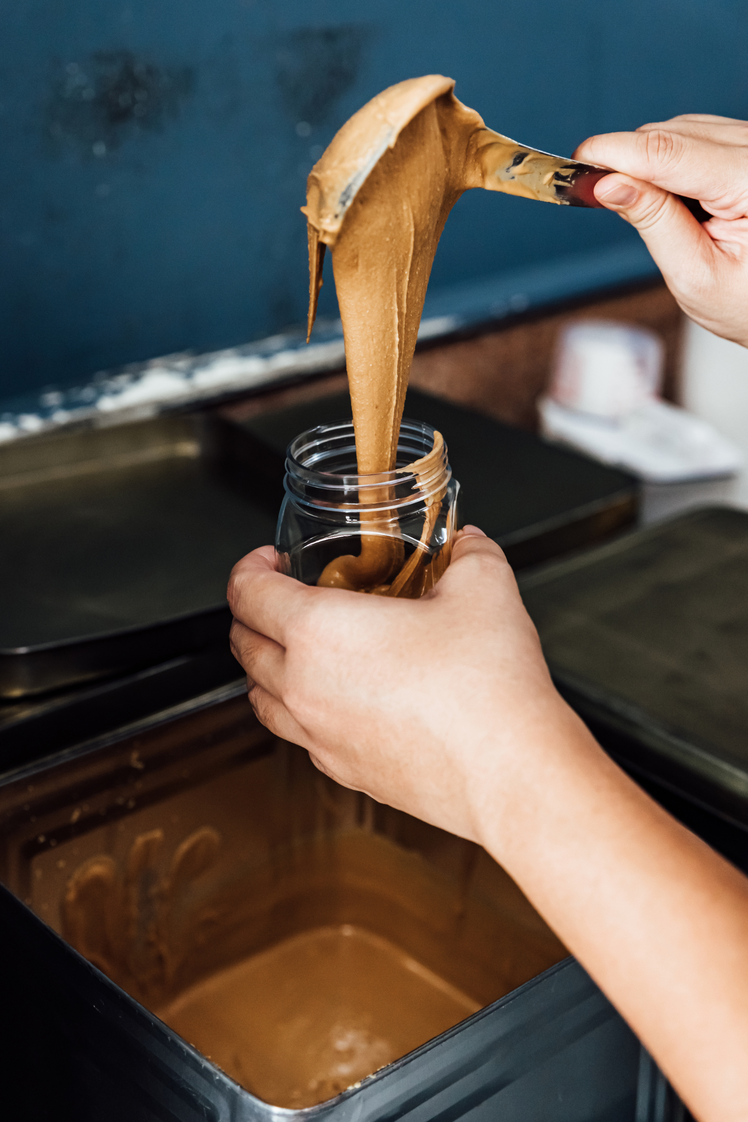 金弘選用臺南牛庄的芝麻,花生主要來自嘉南平原,端午節前後也會向屏東原住民收購。近年則和臺東東河的小農合作,推出自然農法的花生醬。黃筑憶強調,金弘不用過季與不良品,收購的作物都會放入冰櫃冷藏,避免在高溫溼潤的環境中產生黃麴毒素,確保消費者吃到最新鮮的產品。